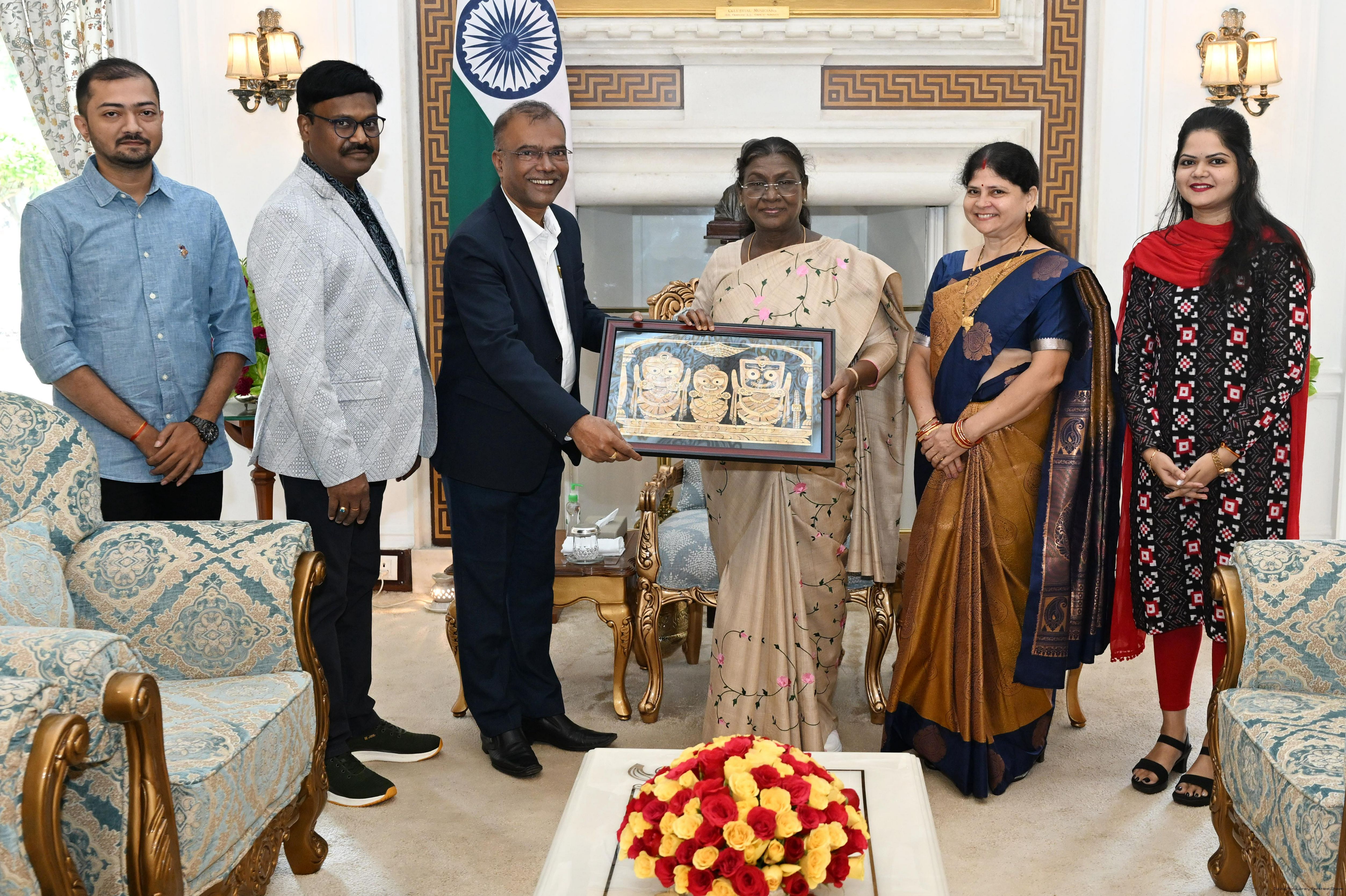 Shri Satish Chandra Samal, APS to the CM of Odisha along with wife Nalini Kanta Jena and others meeting the President of India Smt. Droupadi Murmu at Rashtrapati Bhavan on September 29, 2025.
