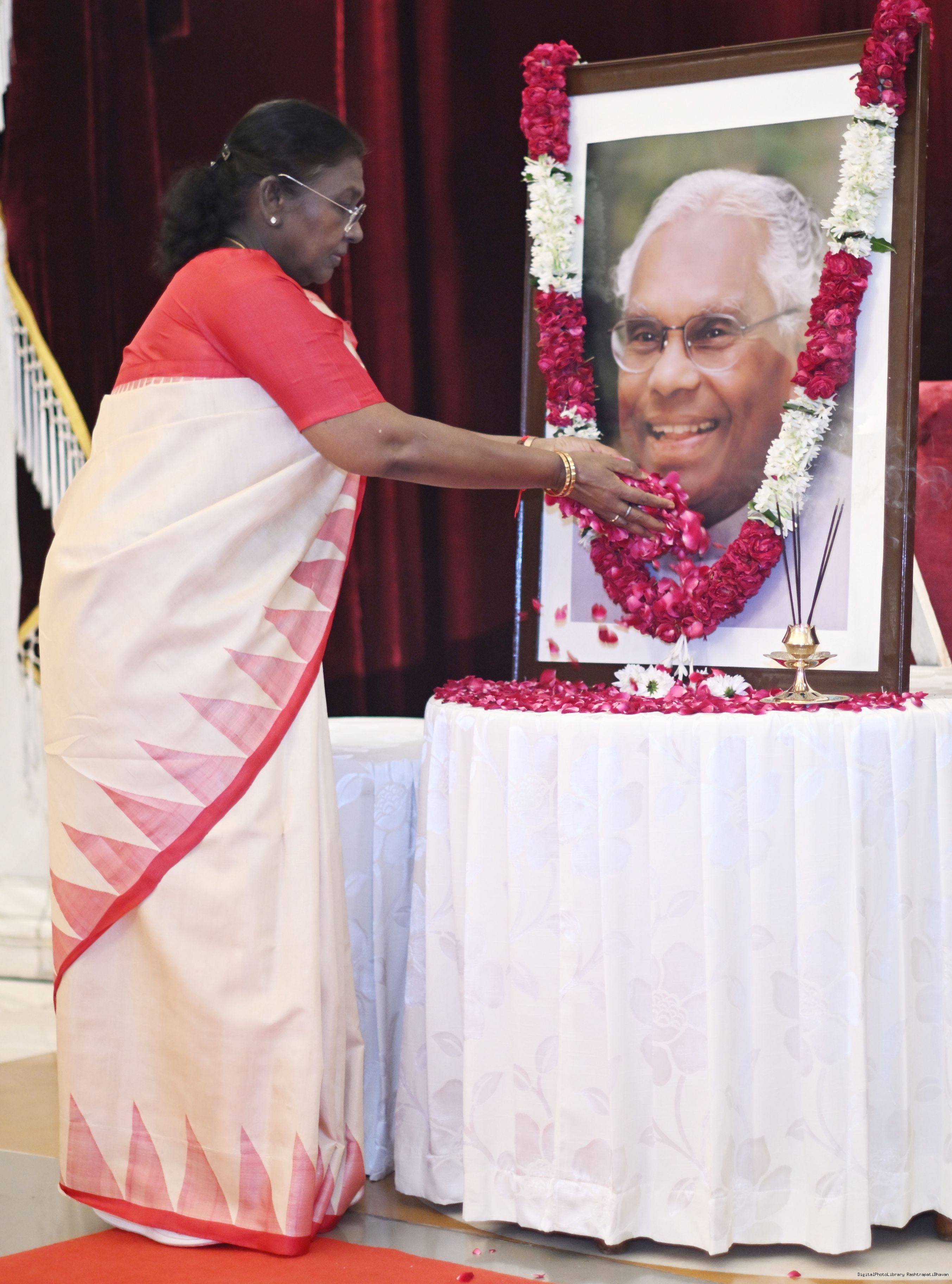 The President of India, Smt Droupadi Murmu paid floral tributes to Shri K.R. Narayanan, former President of India, on his birth anniversary at Rashtrapati Bhavan on October 27, 2025.
