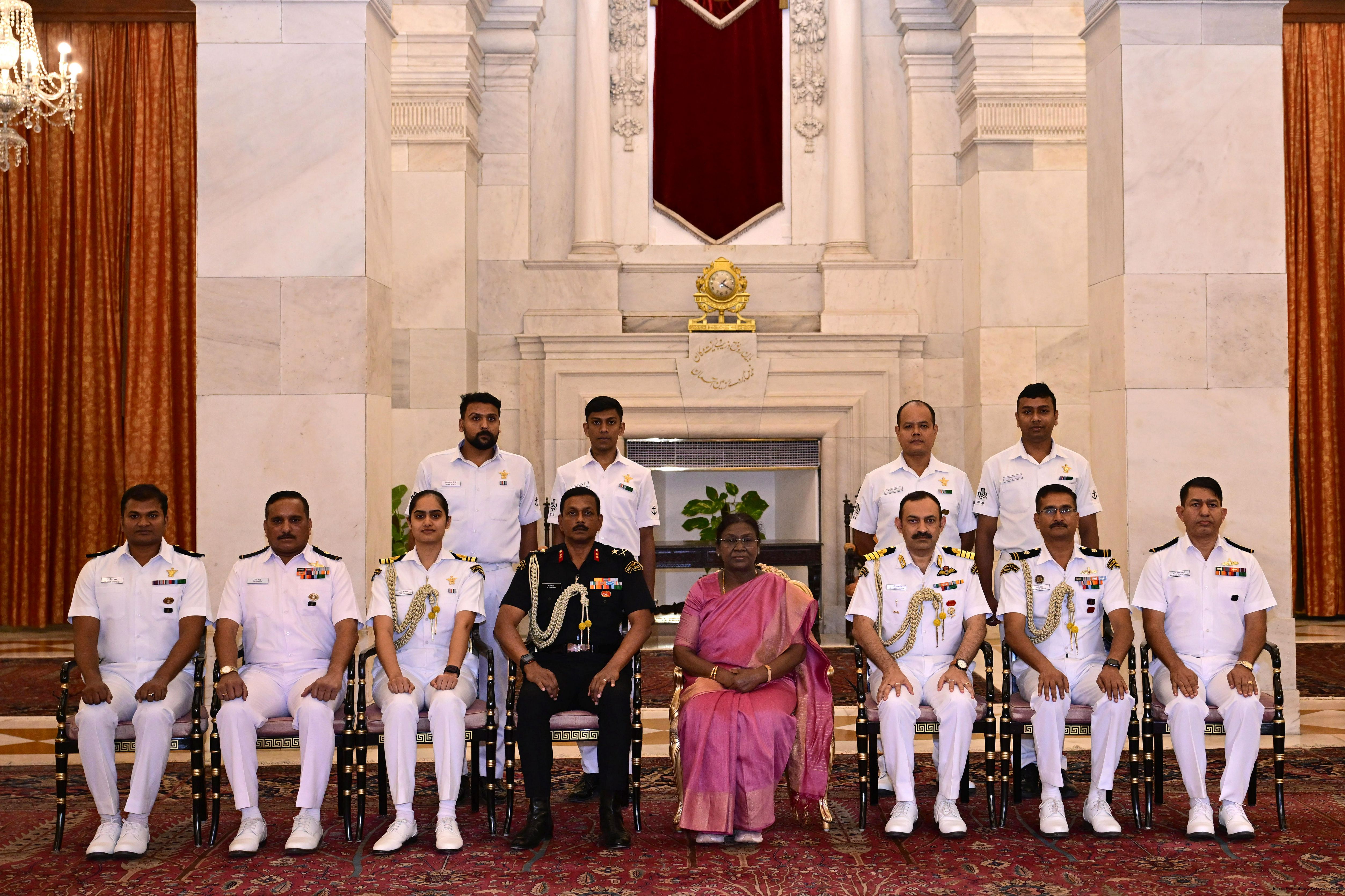 The President of India, Smt Droupadi Murmu posing a group photograph with Naval personnel attached with Rashtrapati Bhavan on December 4, 2025.
