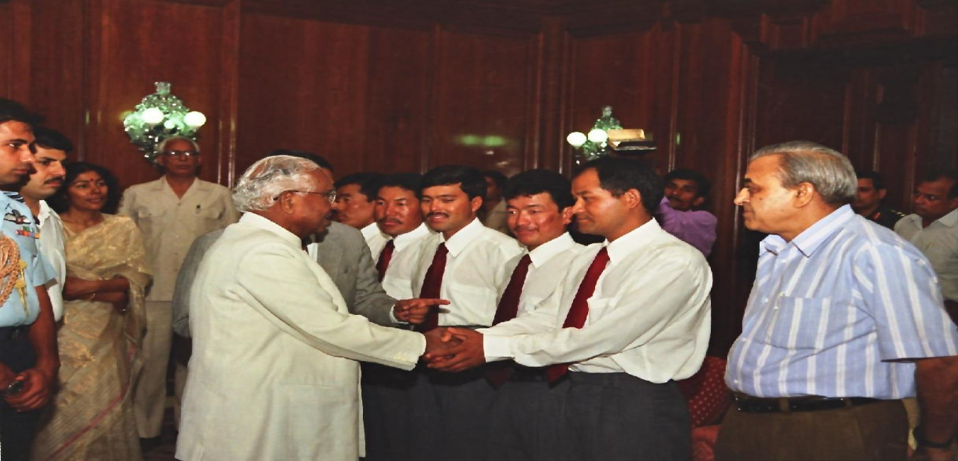 The President of India, Shri K R Narayanan meeting with the Members of the Millennium Indian Everest (Kangshung Face) Expedition-1999 led by Smt Santosh Yadav and Officials of Indian Adventure and Mountaineering Association at the Committee Room of Rashtrapati Bhavan in New Delhi on June 19, 1999