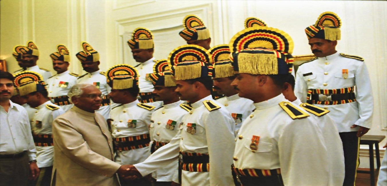 The President of India, Shri K R Narayanan posing for a Group Photograph with the 1 EME Regiment Centre Brass Band at the East Lawn of Rashtrapati Bhavan in New Delhi on June 29, 2000