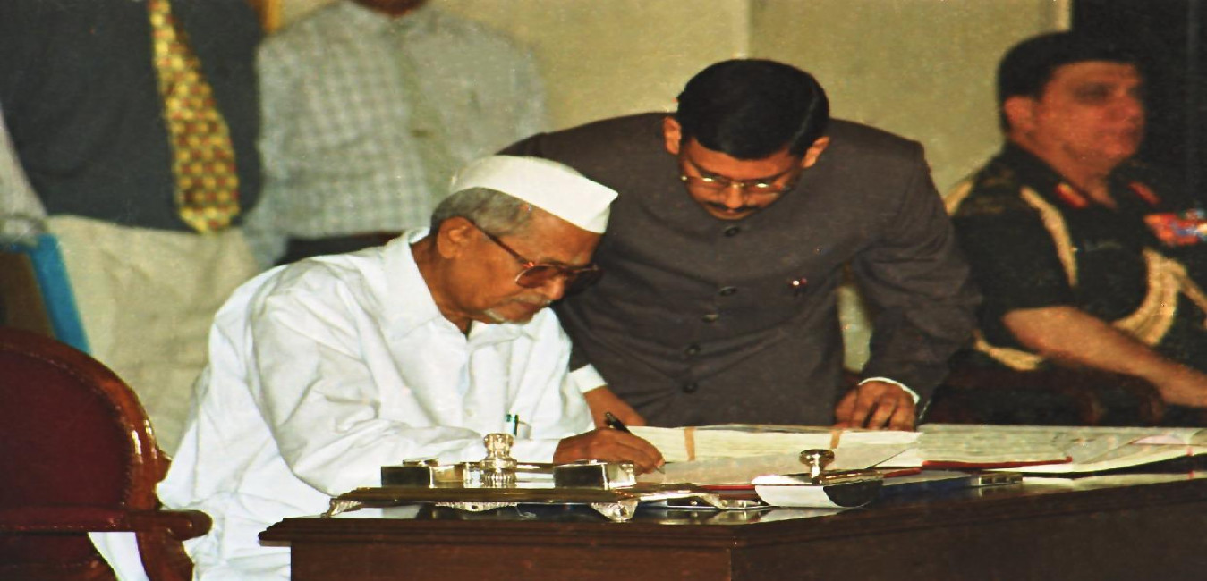 The President of India, Shri K R Narayanan at the Swearing-in-Ceremony of the Council of Ministers at the Ashok Hall of Rashtrapati Bhavan in New Delhi on July 01, 2002