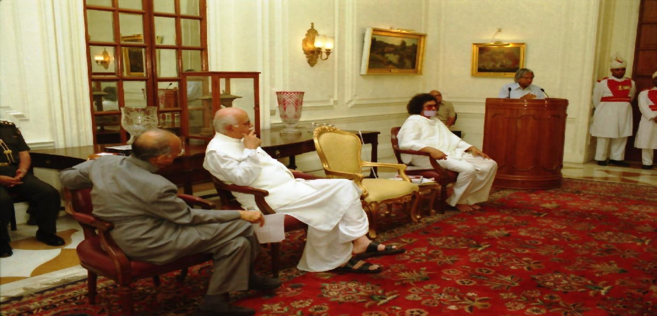 The President of India, Dr A P J Abdul Kalam receiving the Book Finding Your Spiritual Centre and the Quest for Truth on the occasion of 84th Birthday Ceremony of HH Acharya Shree Mahapragya at the Yellow Drawing Room of Rashtrapati Bhavan in New Delhi on June 23, 2003