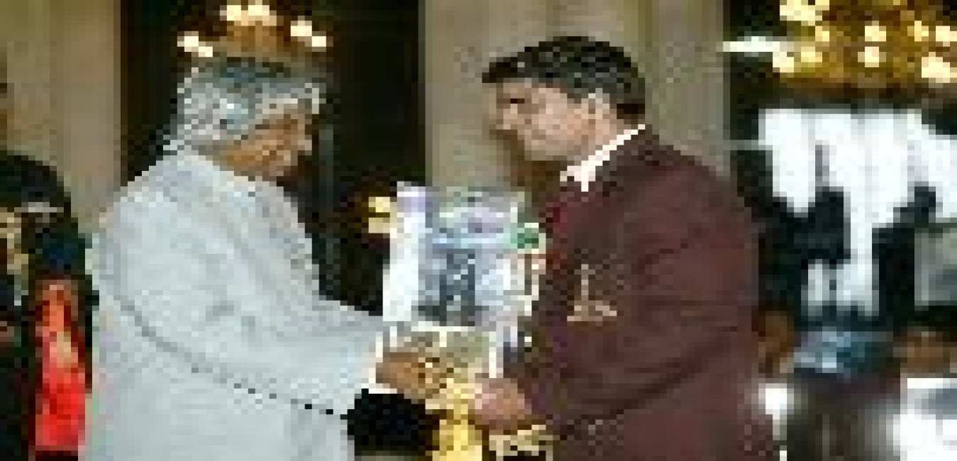 The President of India, Dr A P J Abdul Kalam presenting the Book "Wisdom of Vashishtha" by Shri L N Jhunjhunwala and others at Rashtrapati Bhavan in New Delhi on Oct 18, 2004