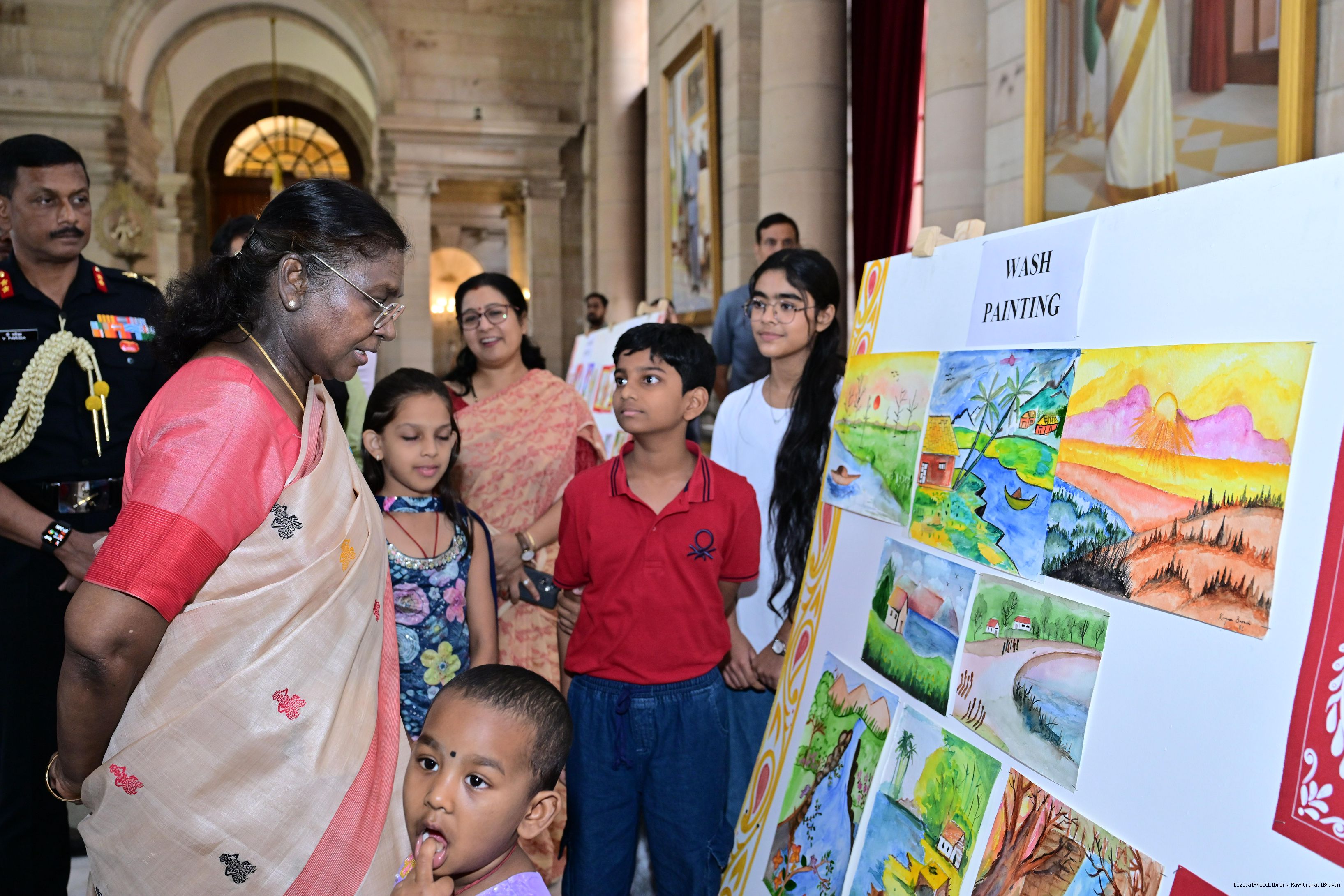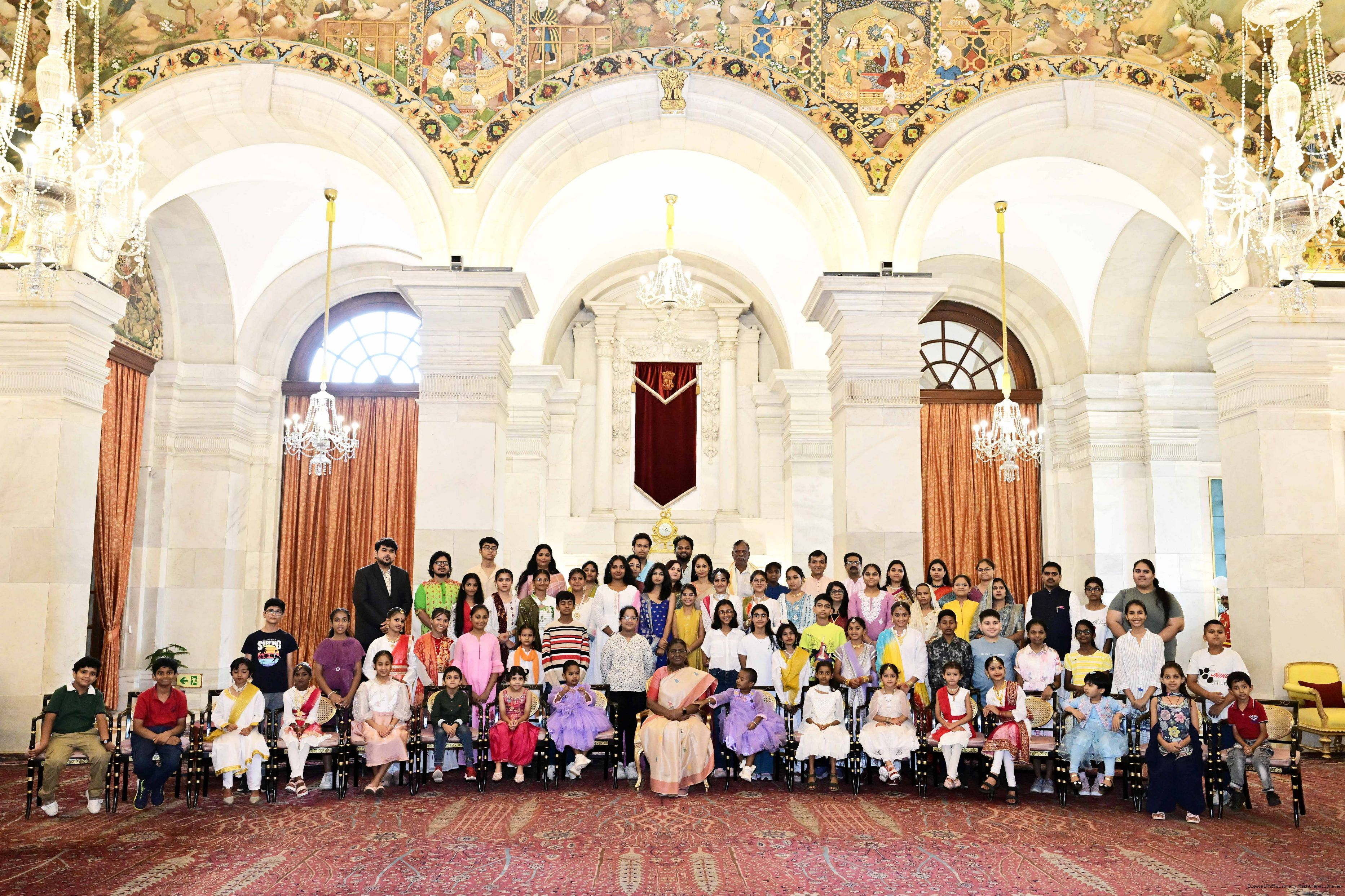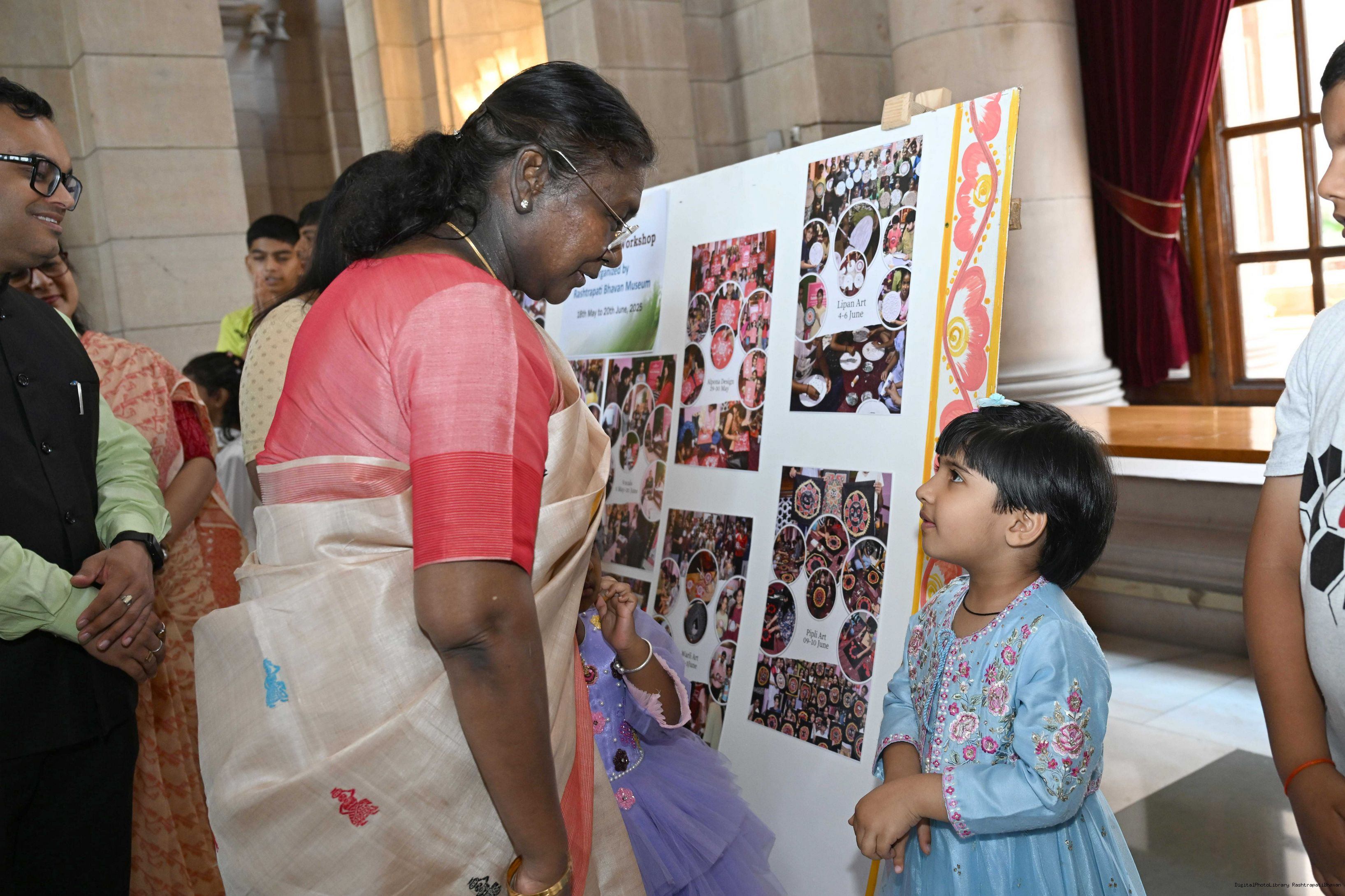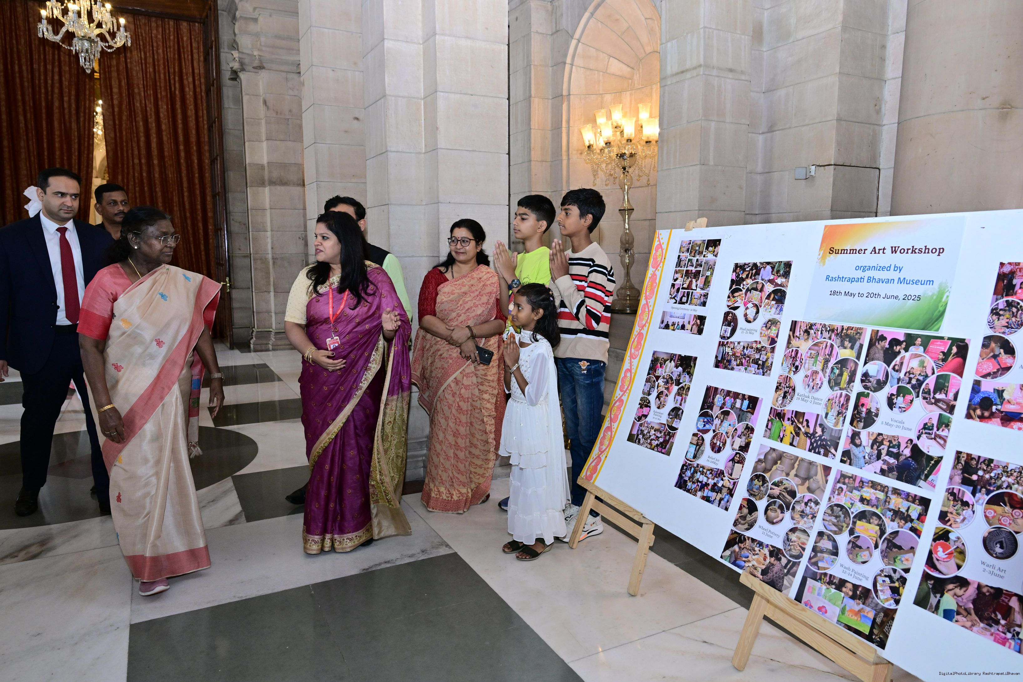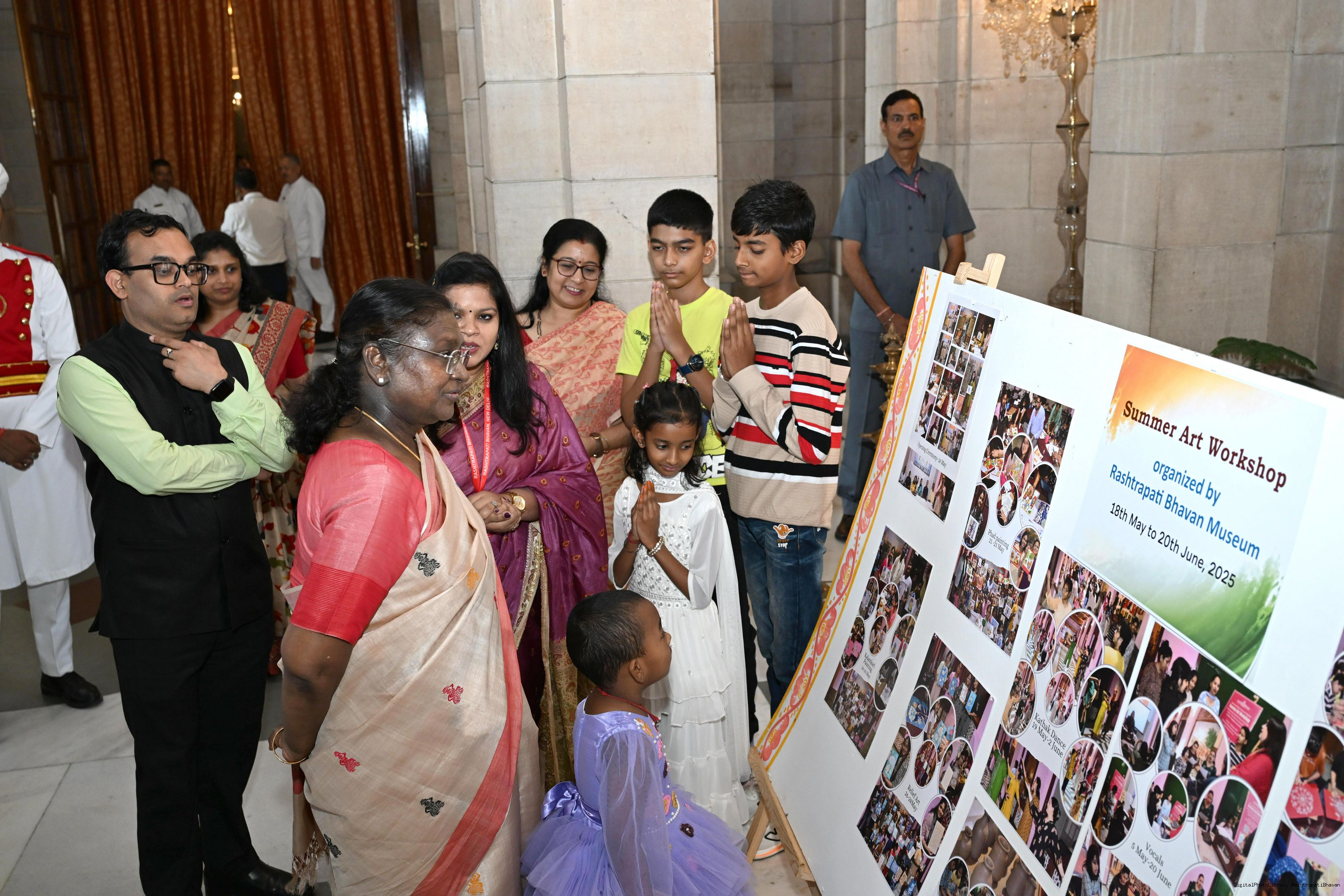 The President of India, Smt Droupadi Murmu interacted with photo opportunity with around 70 children from the Summer Workshop at President's Estate at Rashtrapati Bhavan on June 27, 2025.