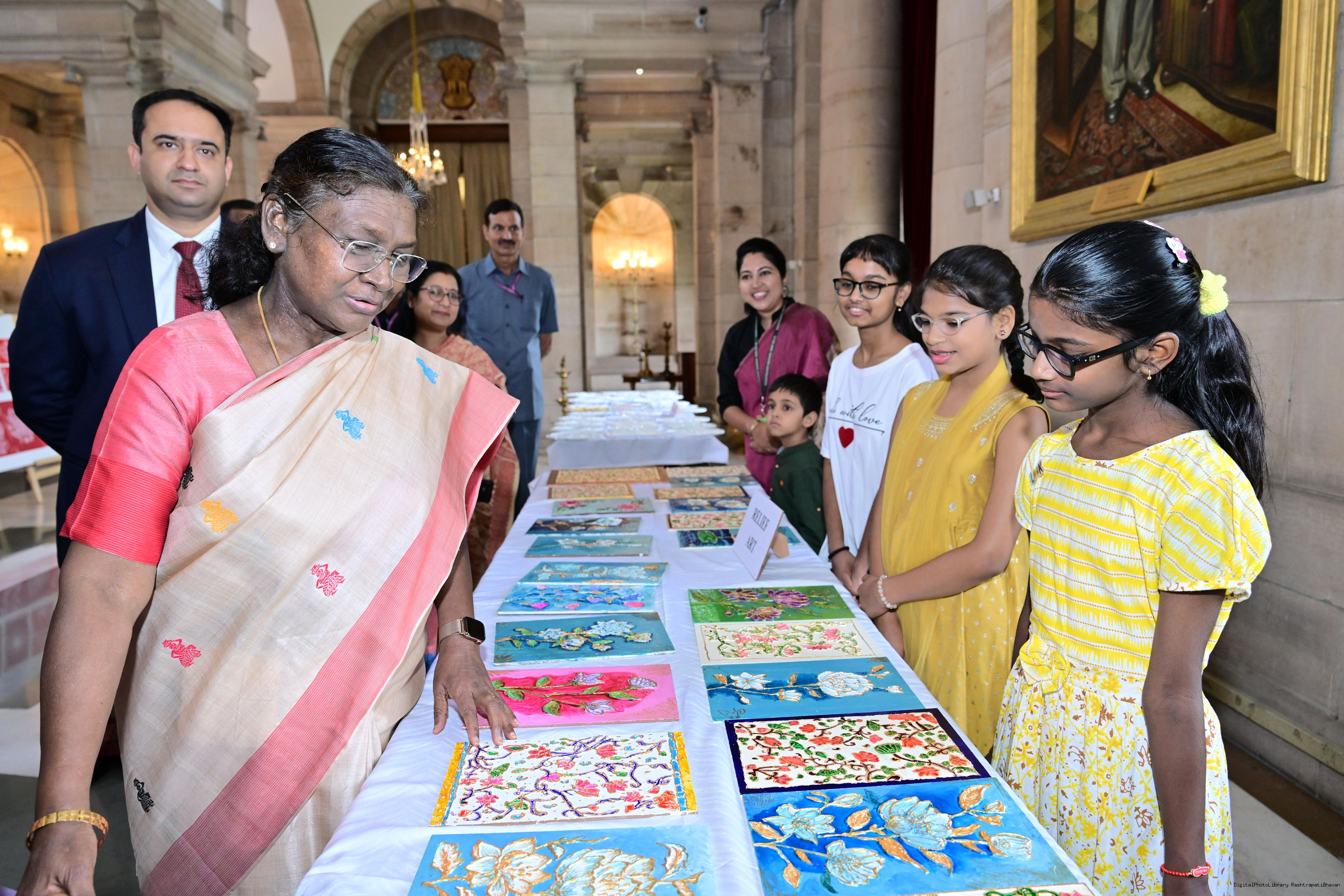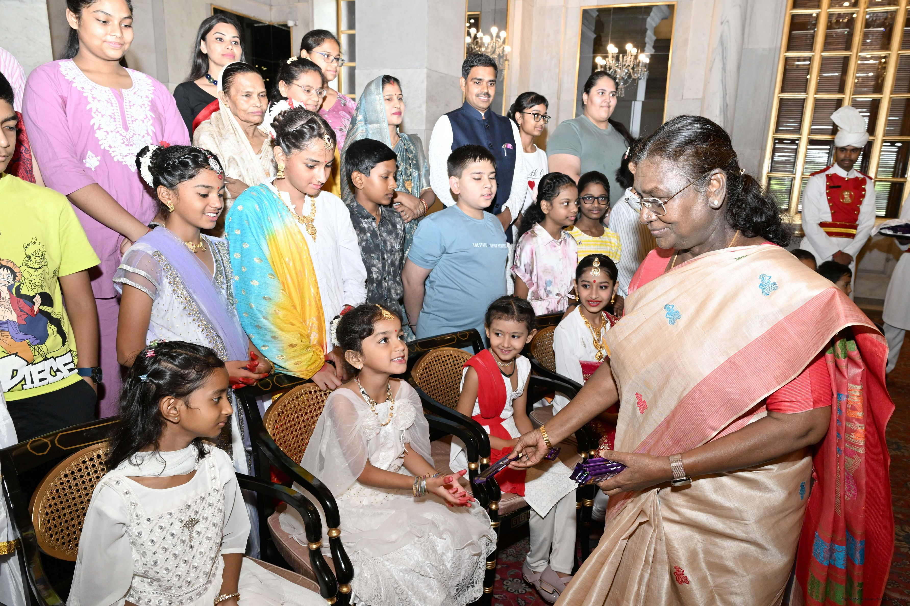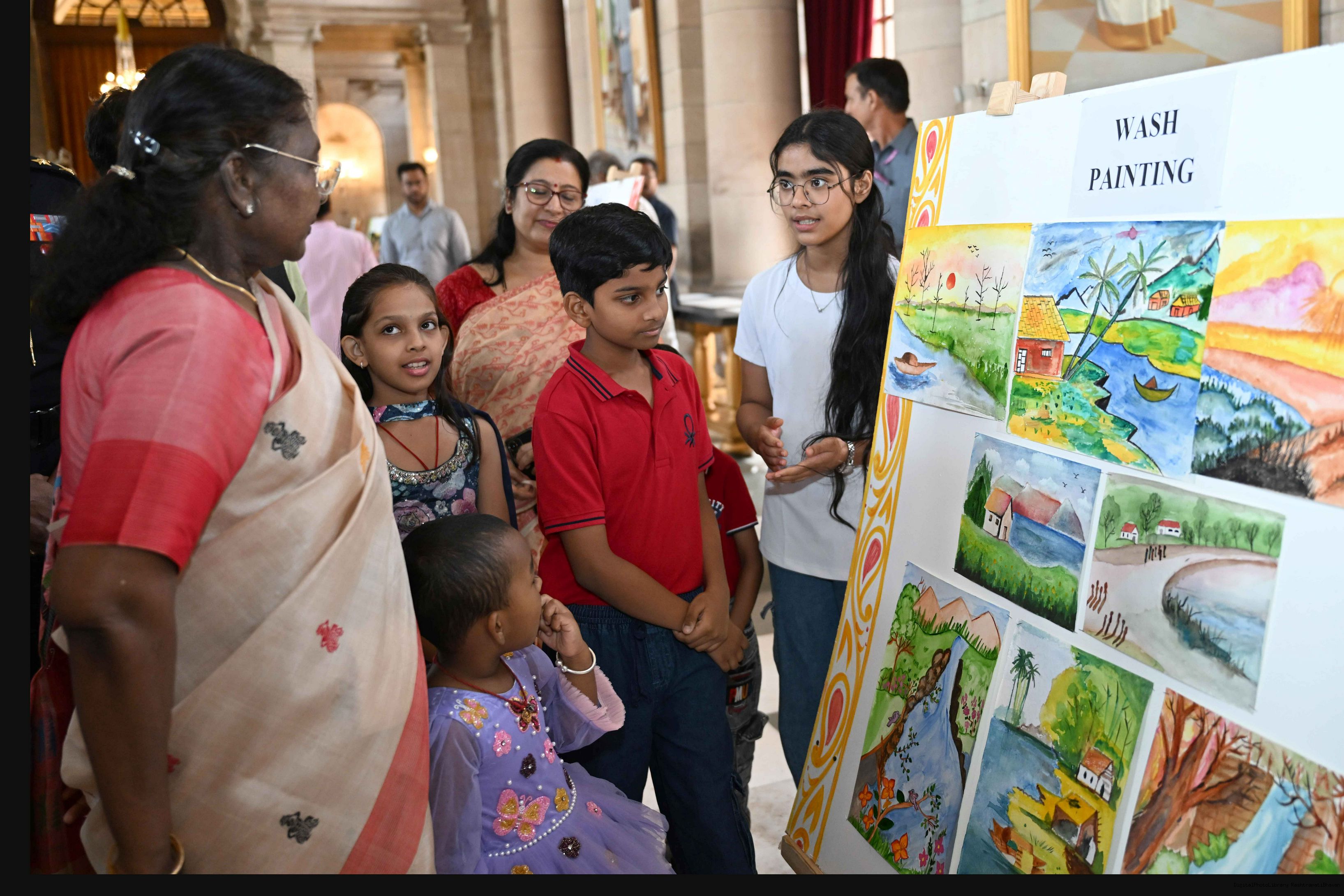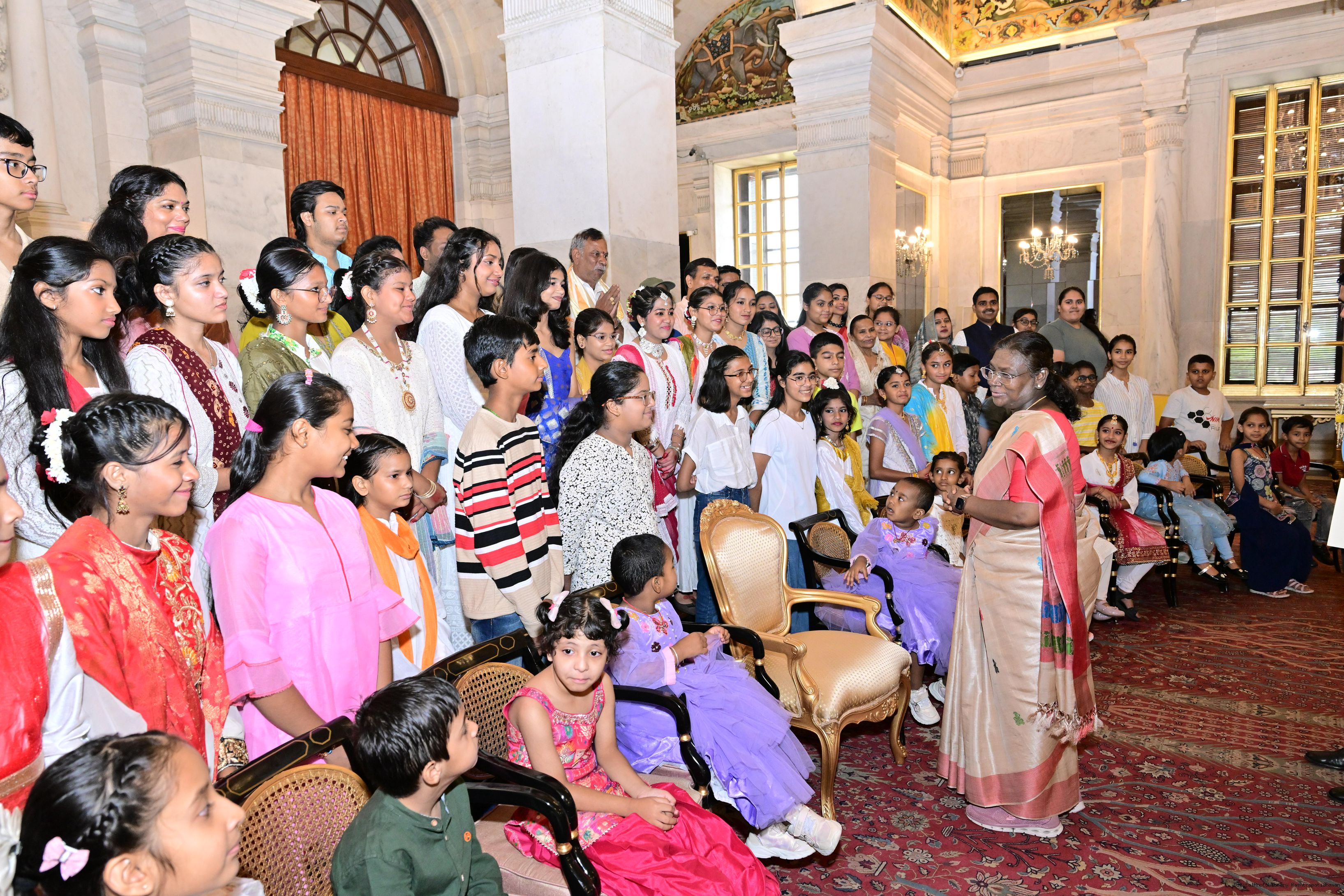 The President of India, Smt Droupadi Murmu interacted with photo opportunity with around 70 children from the Summer Workshop at President's Estate at Rashtrapati Bhavan on June 27, 2025.