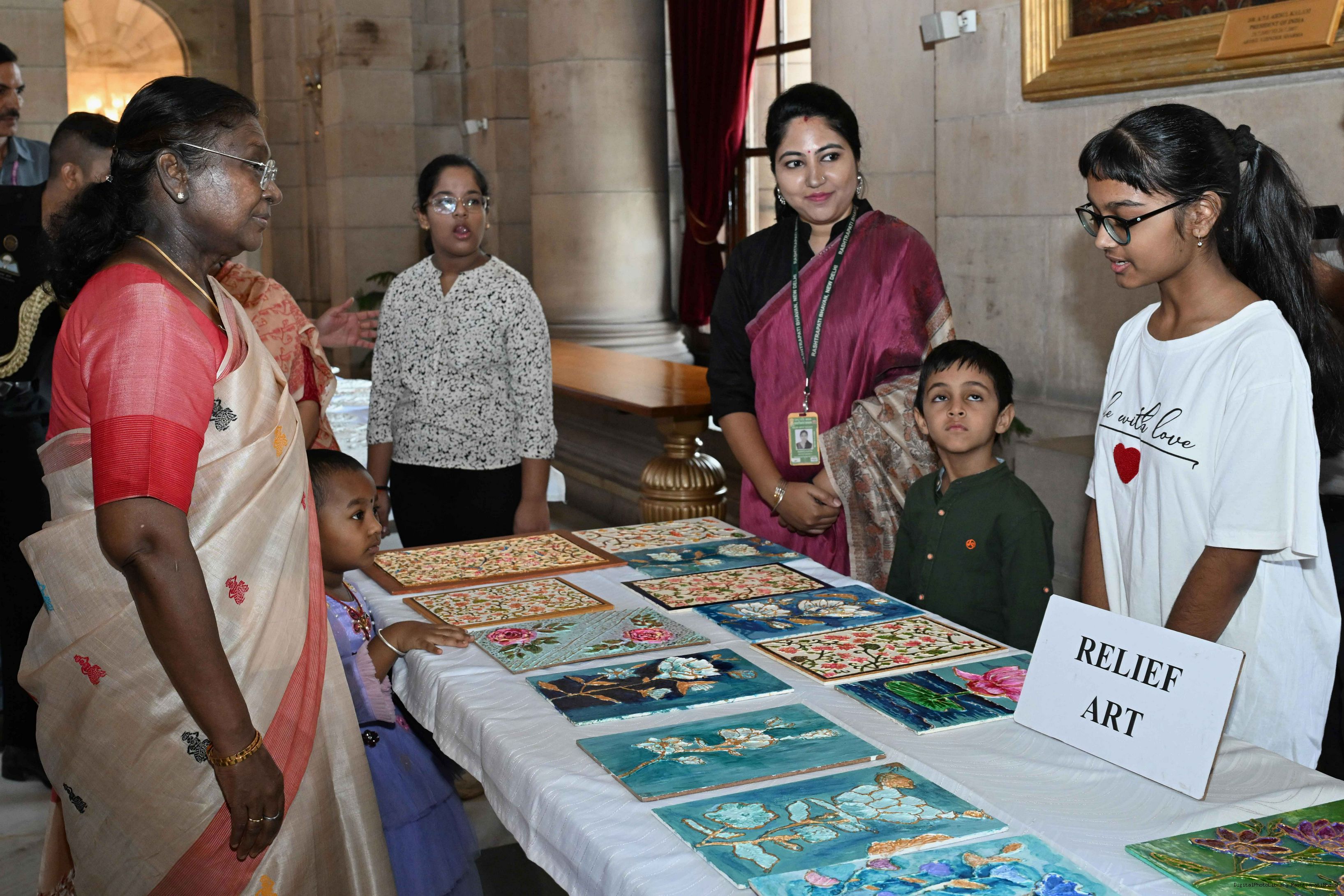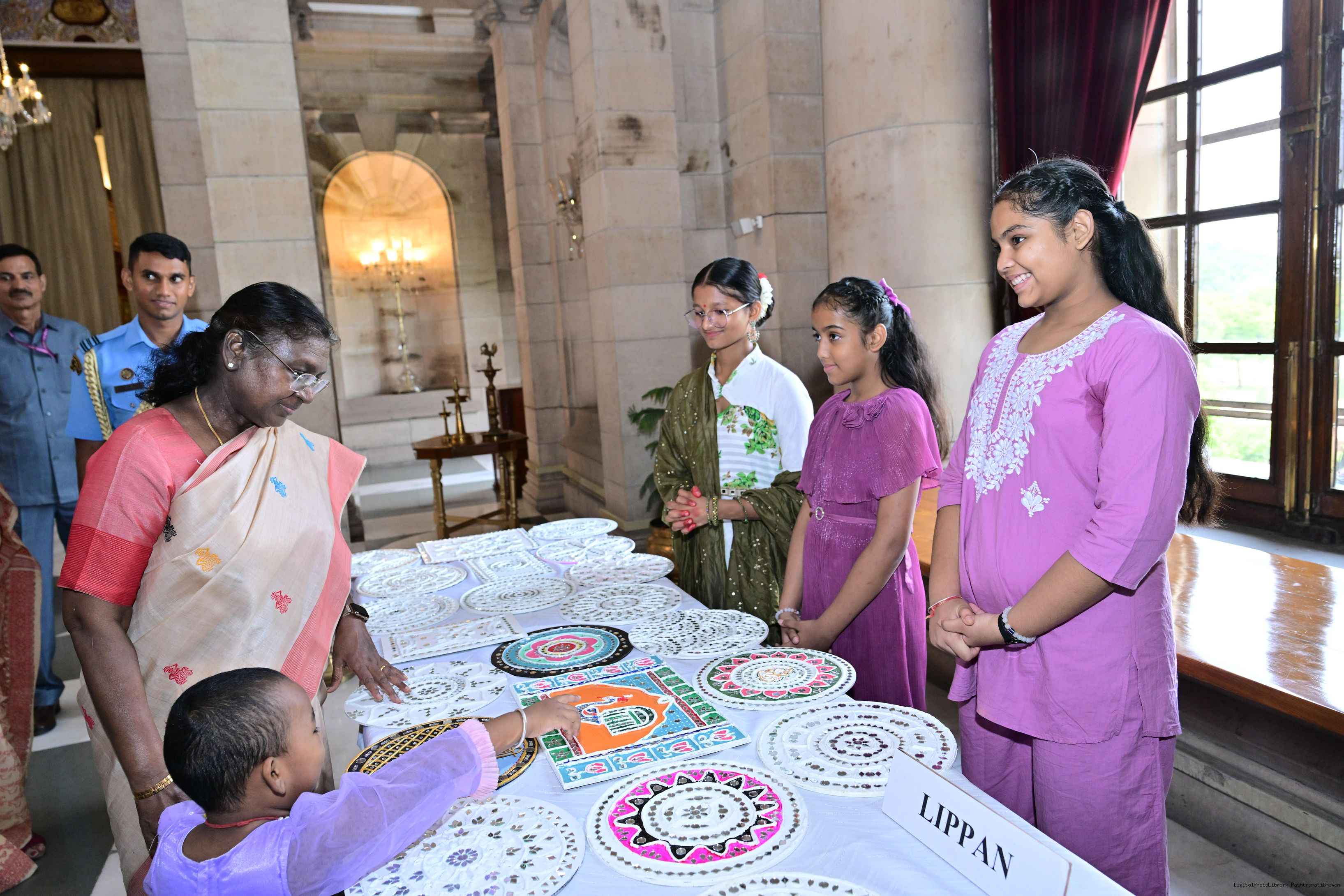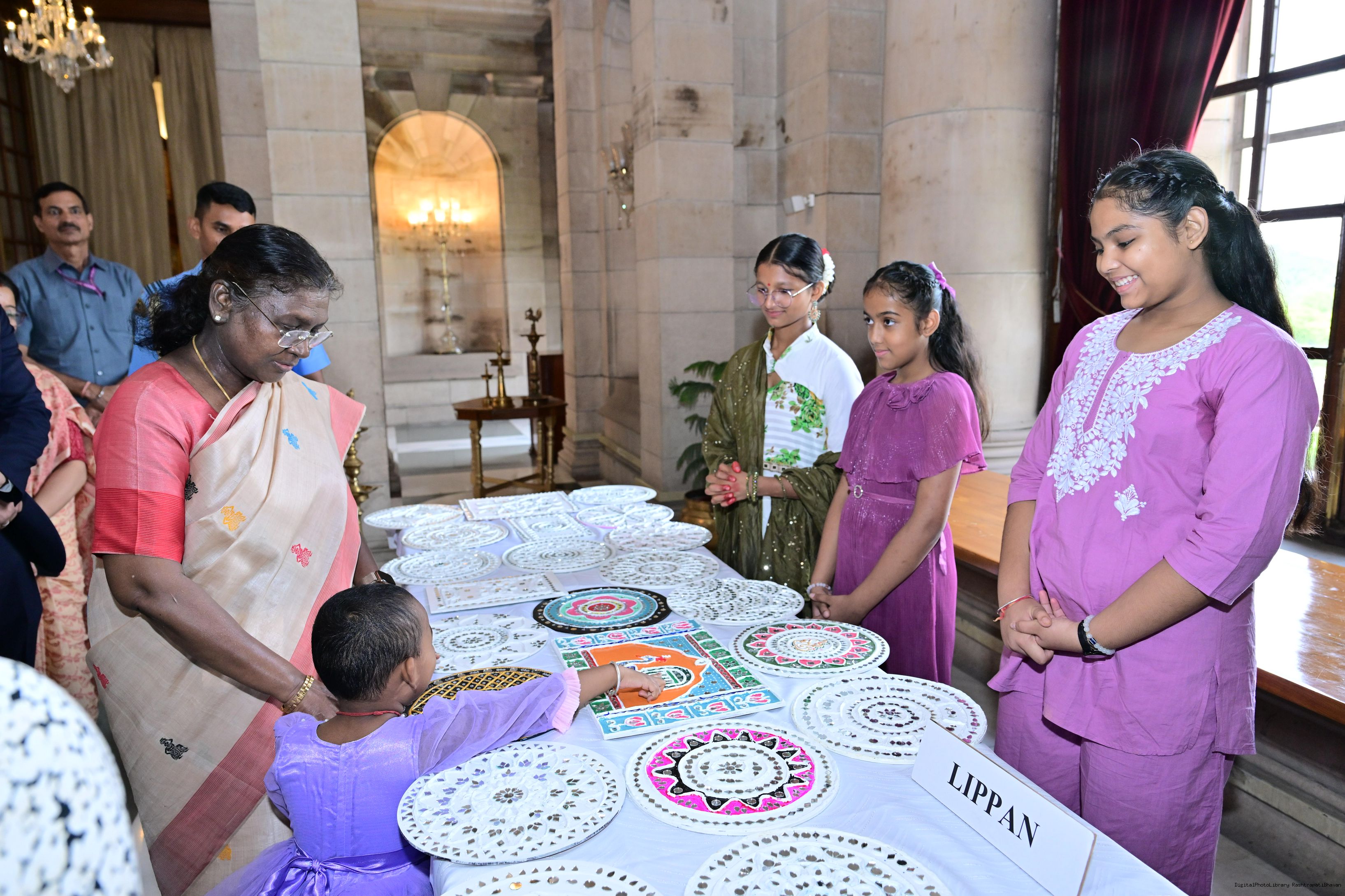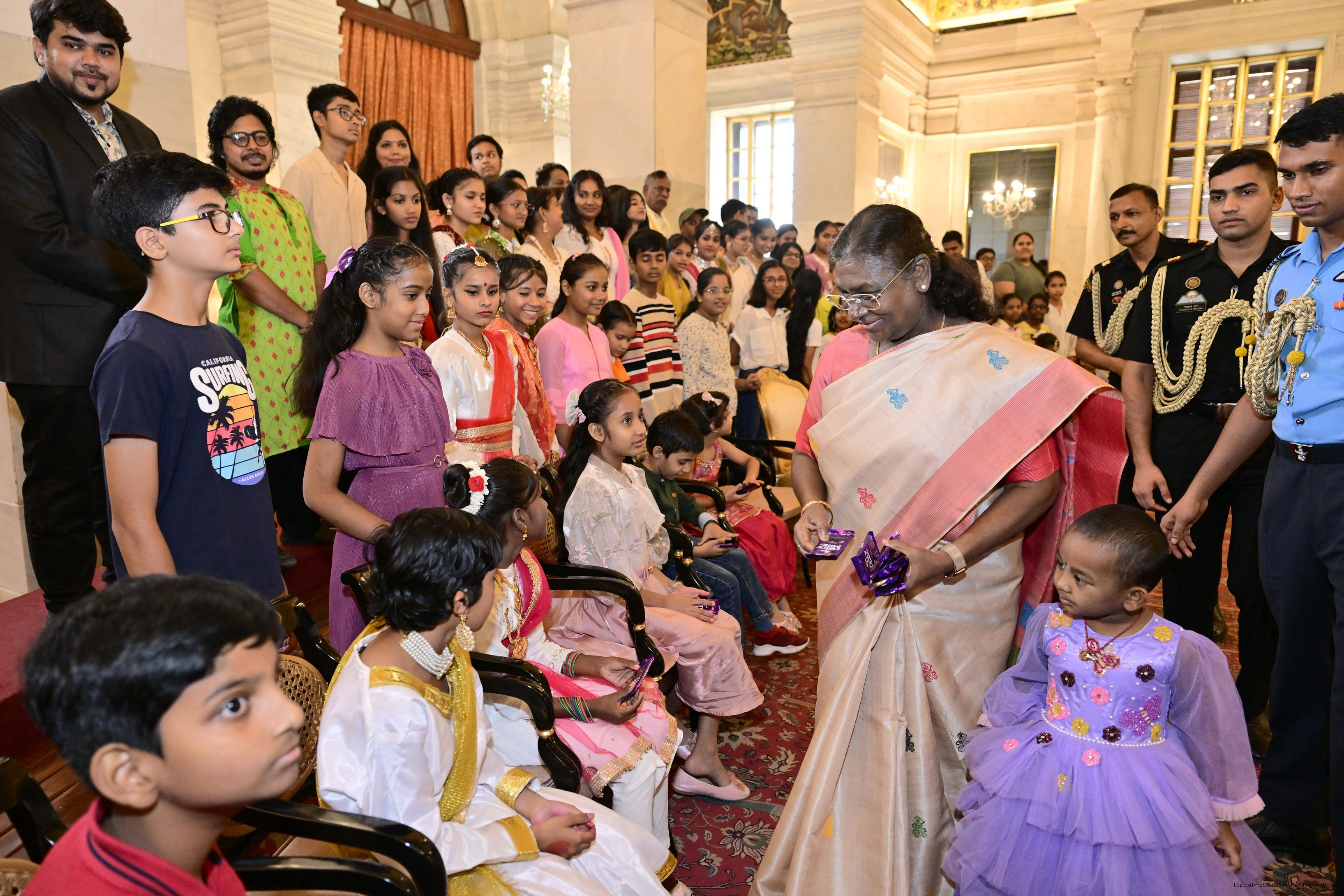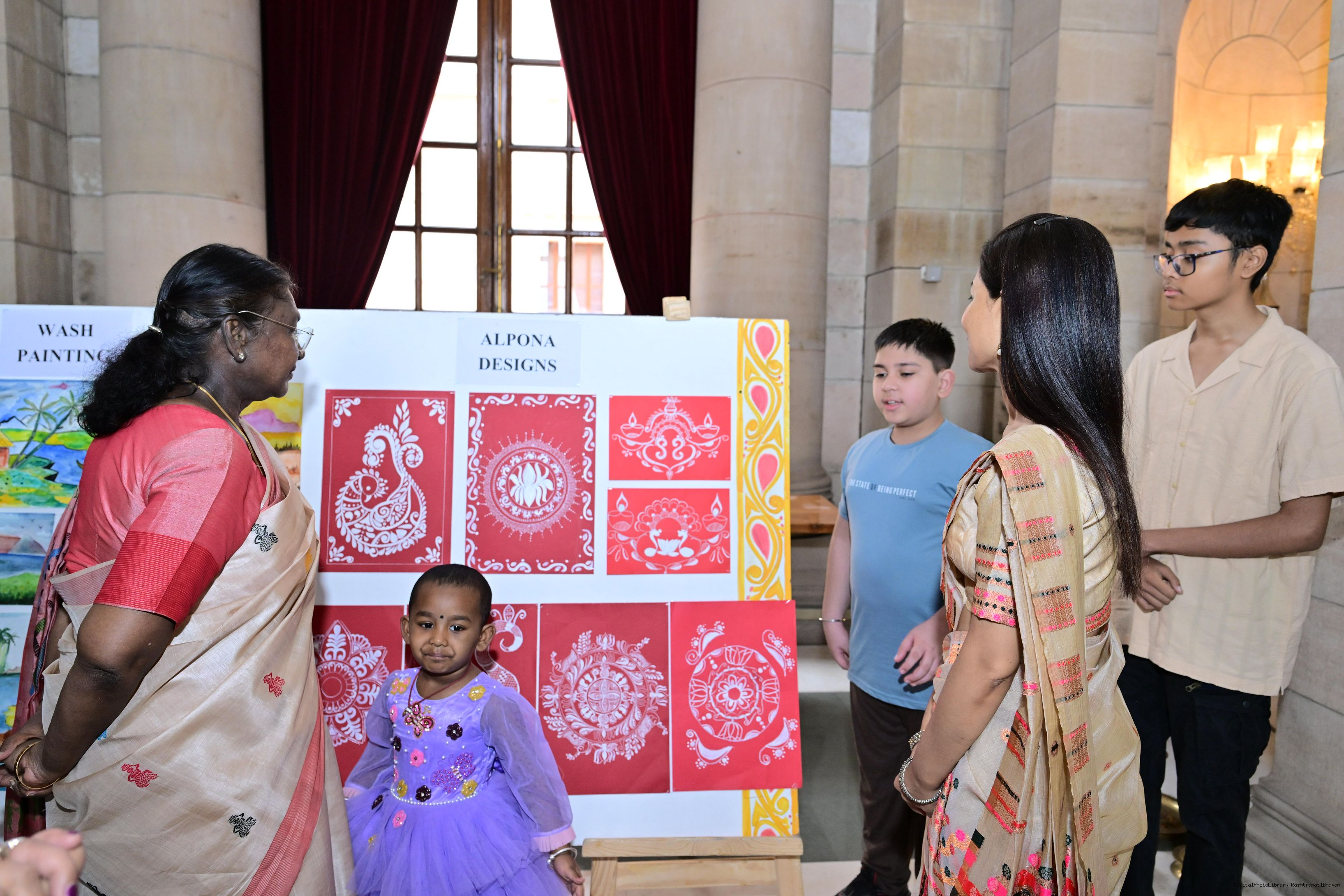 The President of India, Smt Droupadi Murmu interacted with photo opportunity with around 70 children from the Summer Workshop at President's Estate at Rashtrapati Bhavan on June 27, 2025.