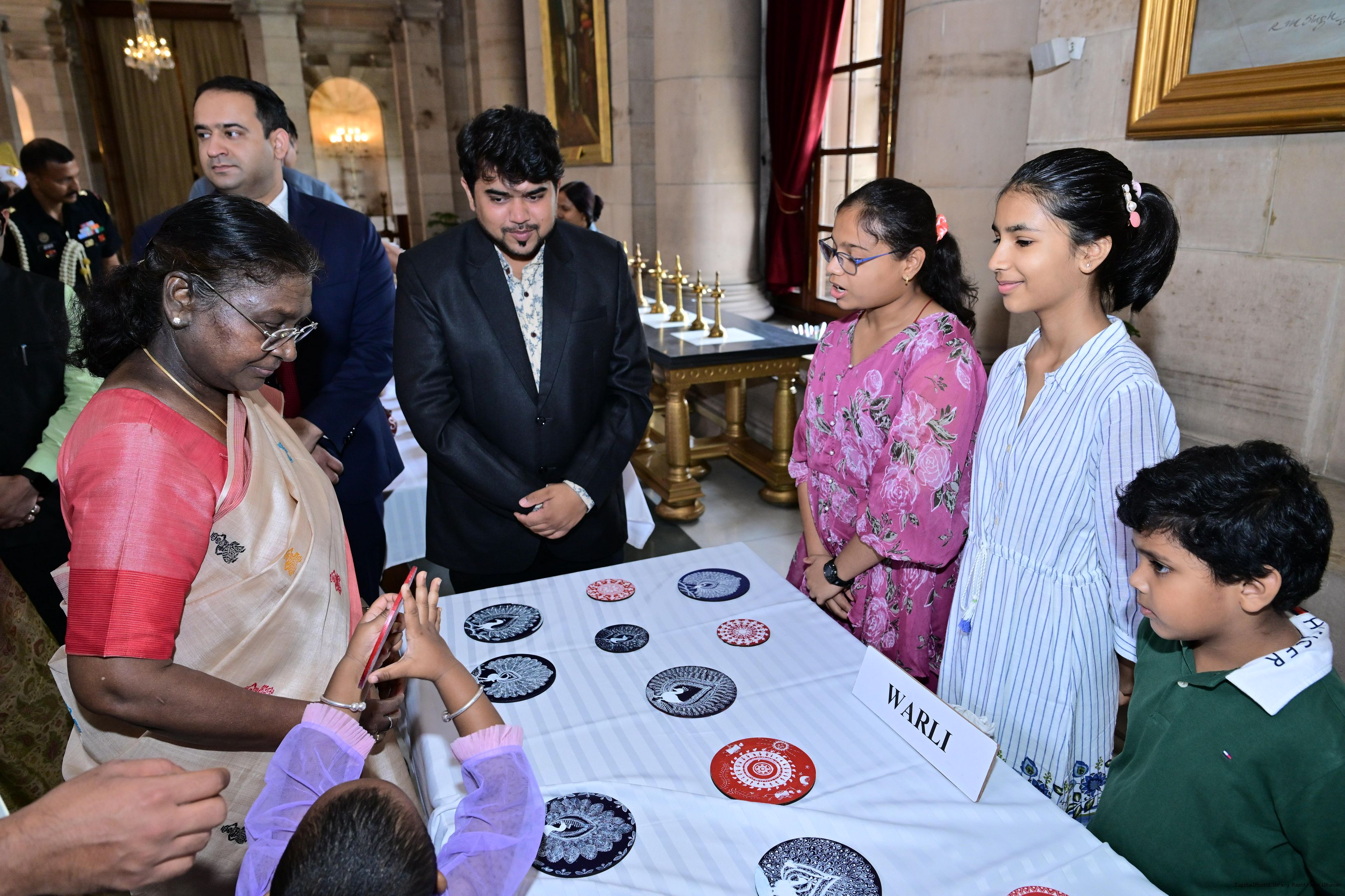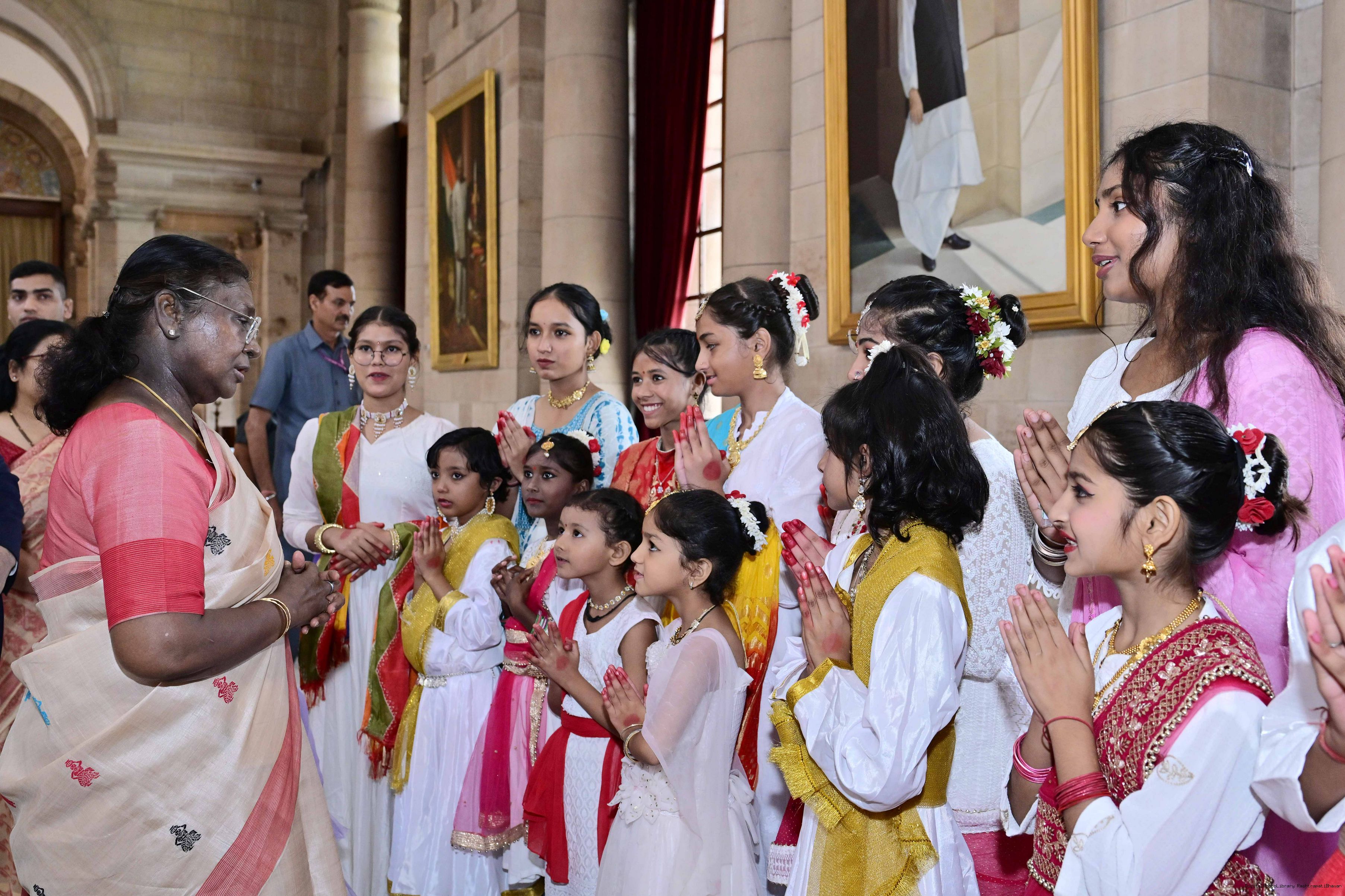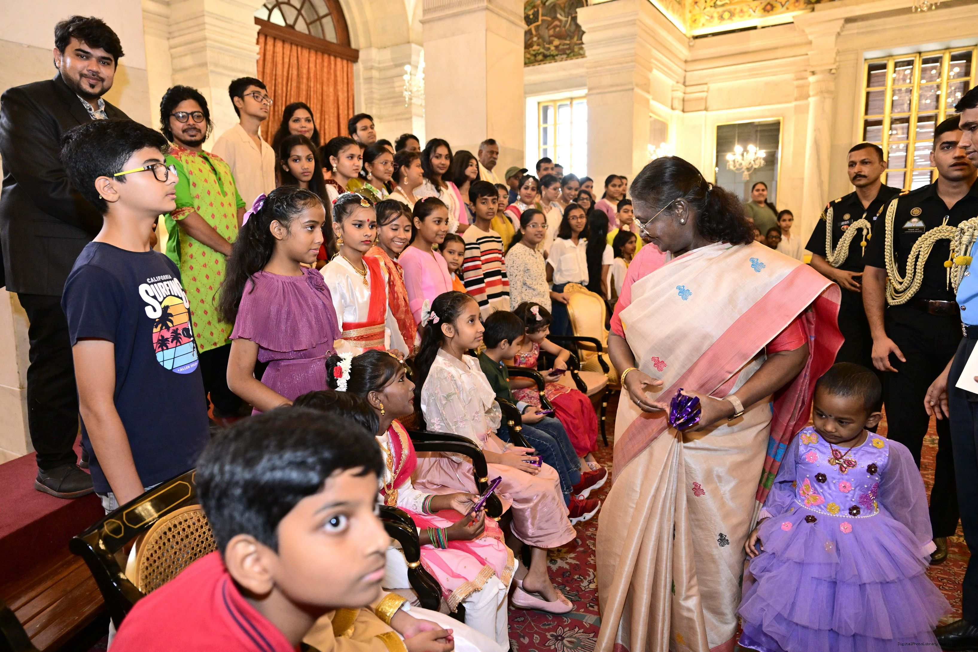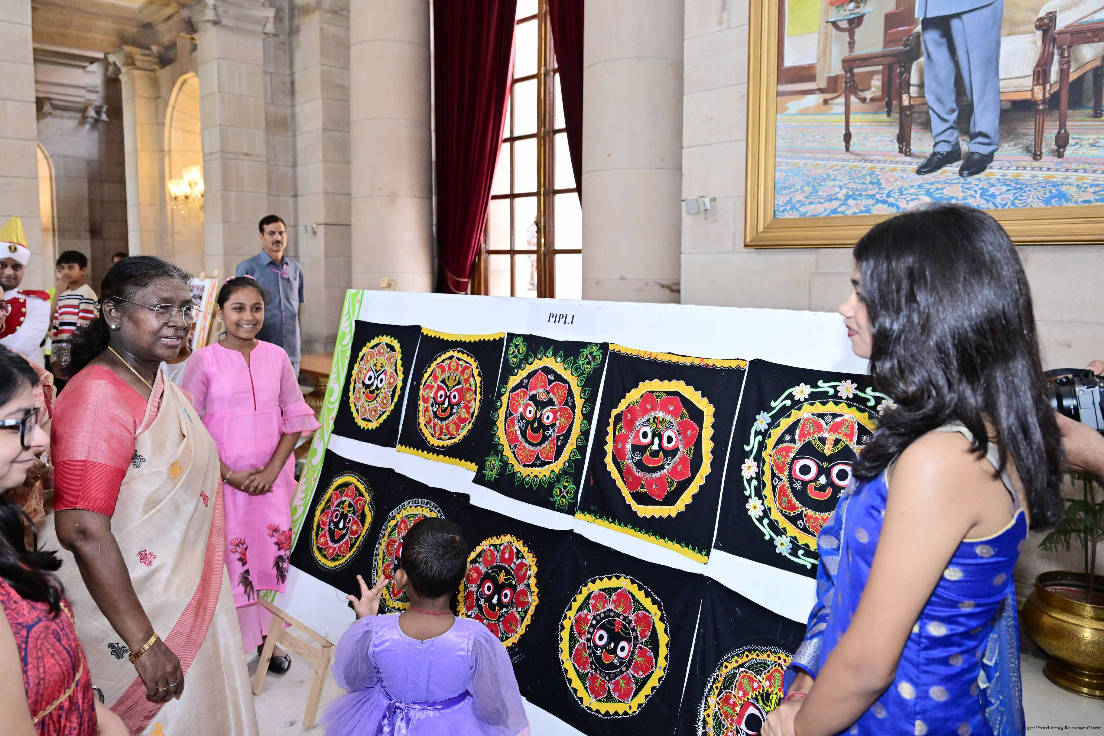 The President of India, Smt Droupadi Murmu interacted with photo opportunity with around 70 children from the Summer Workshop at President's Estate at Rashtrapati Bhavan on June 27, 2025.