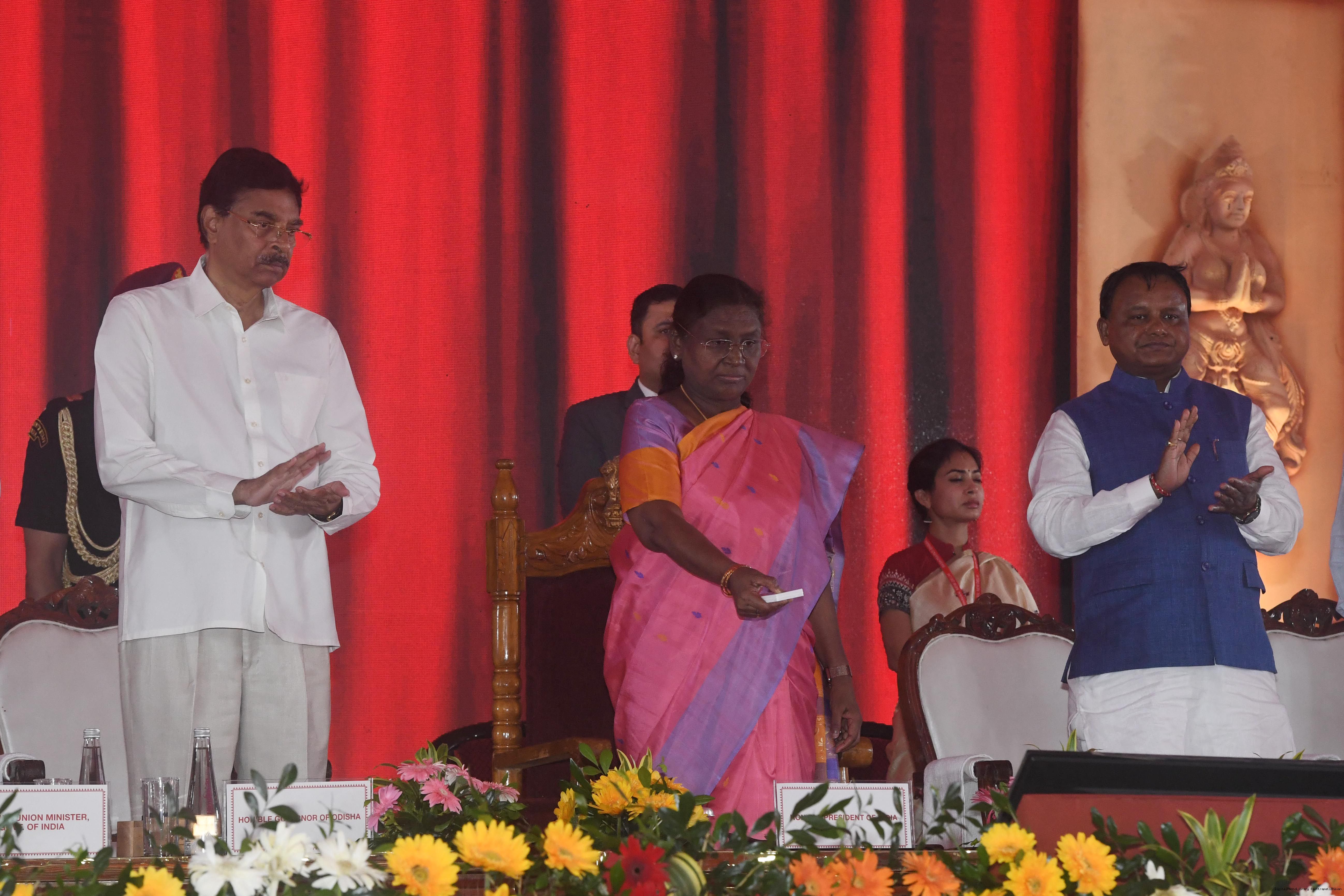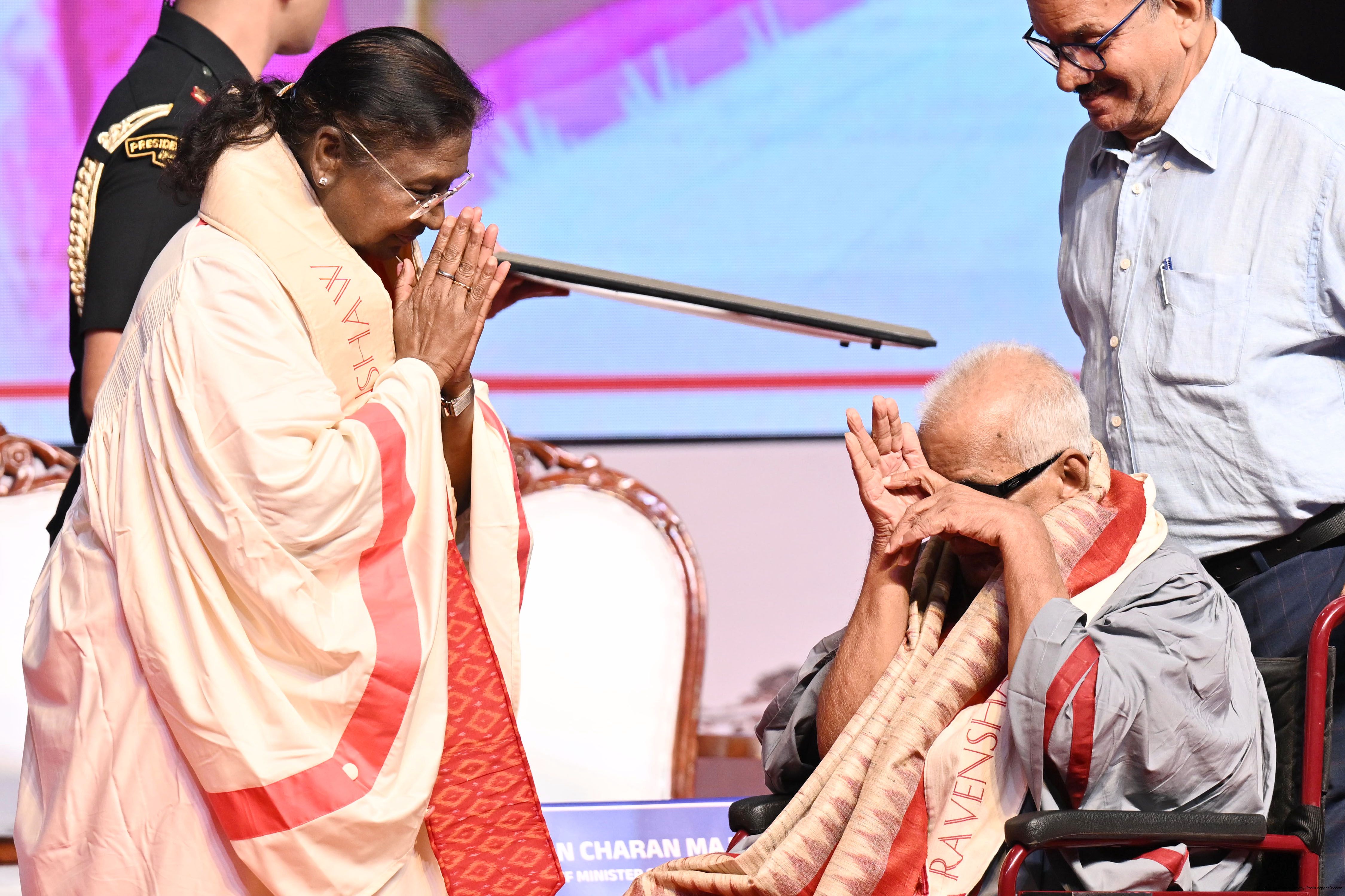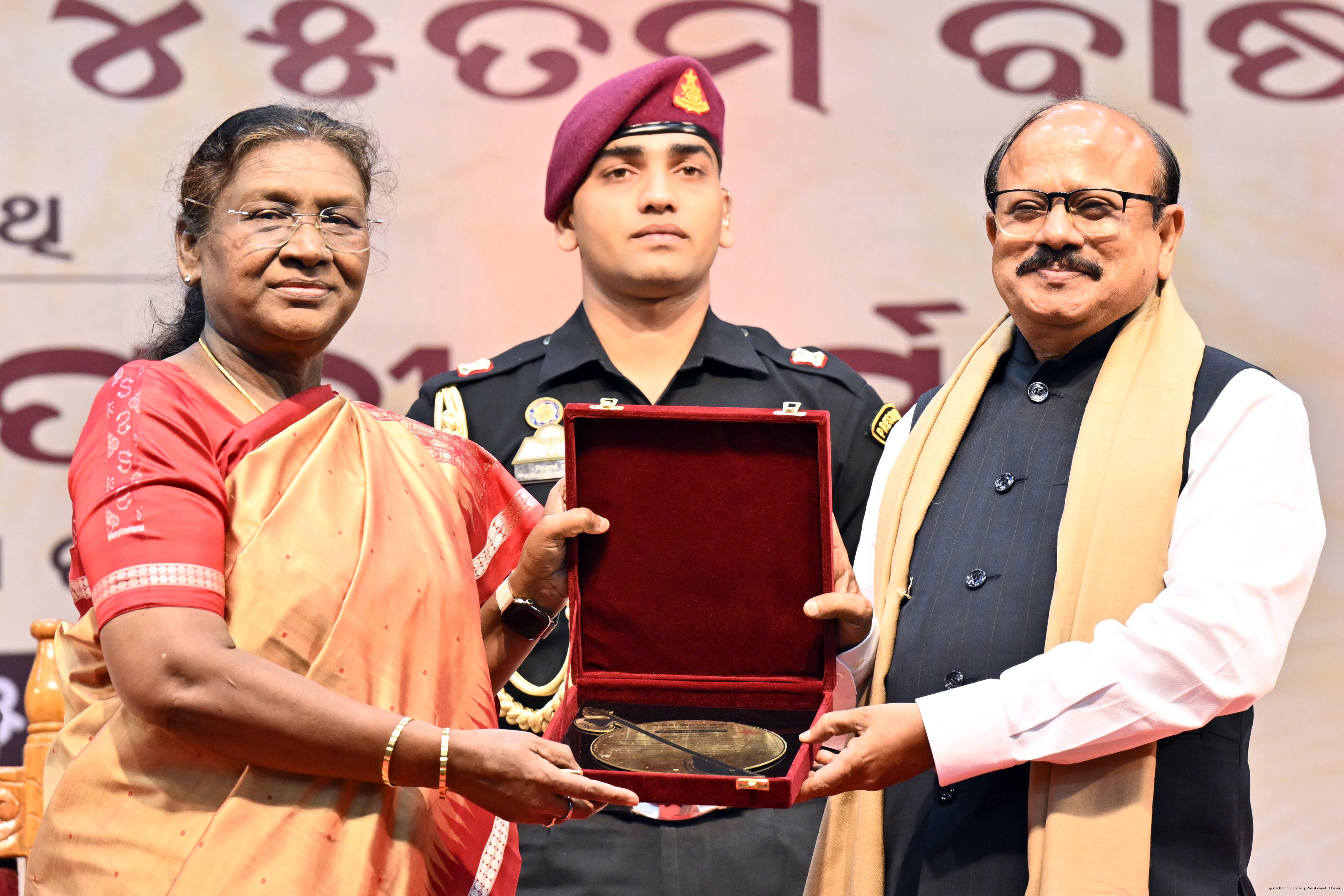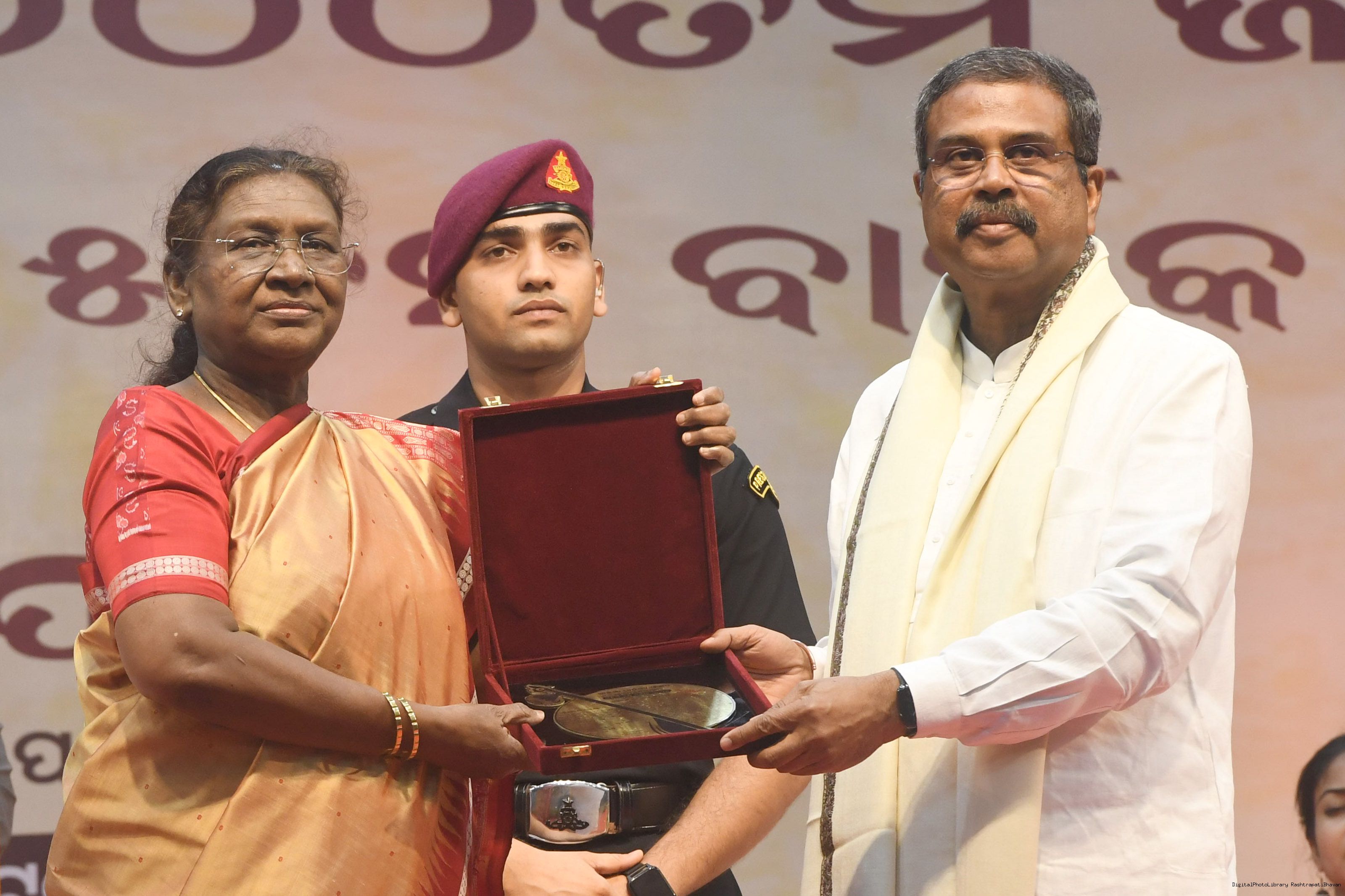The President of India, Smt Droupadi Murmu, graced the birth anniversary celebrations of Adikabi Sarala Das and presented the Kalinga Ratna Award-2024 to Union Minister for Education, Shri Dharmendra Pradhan at Cuttack, Odisha on July 15, 2025.