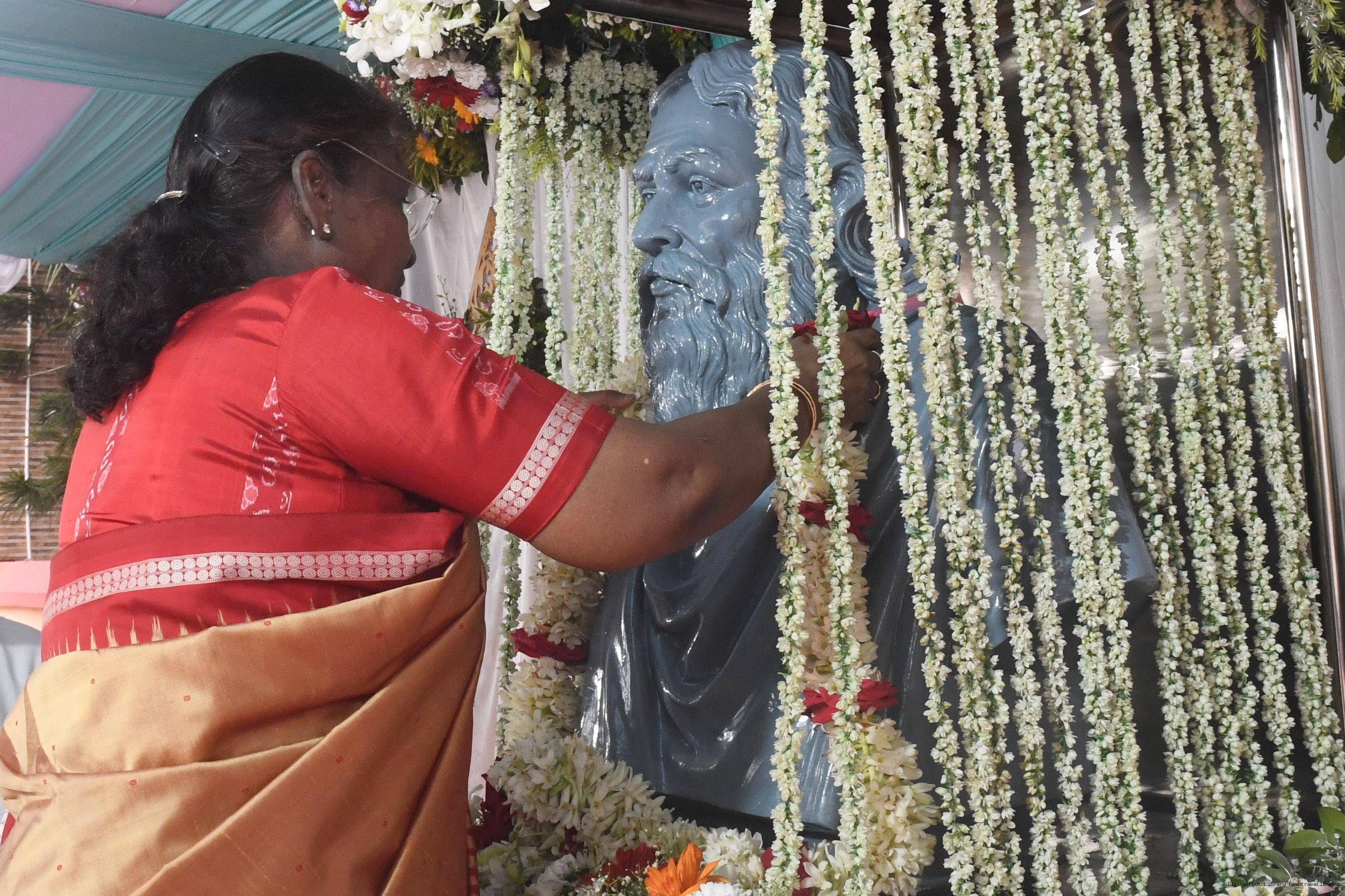 The President of India, Smt Droupadi Murmu paid floral Tribute to the statue of Adikabi Sarala Das at Cuttack, Odisha, on July 15, 2025.