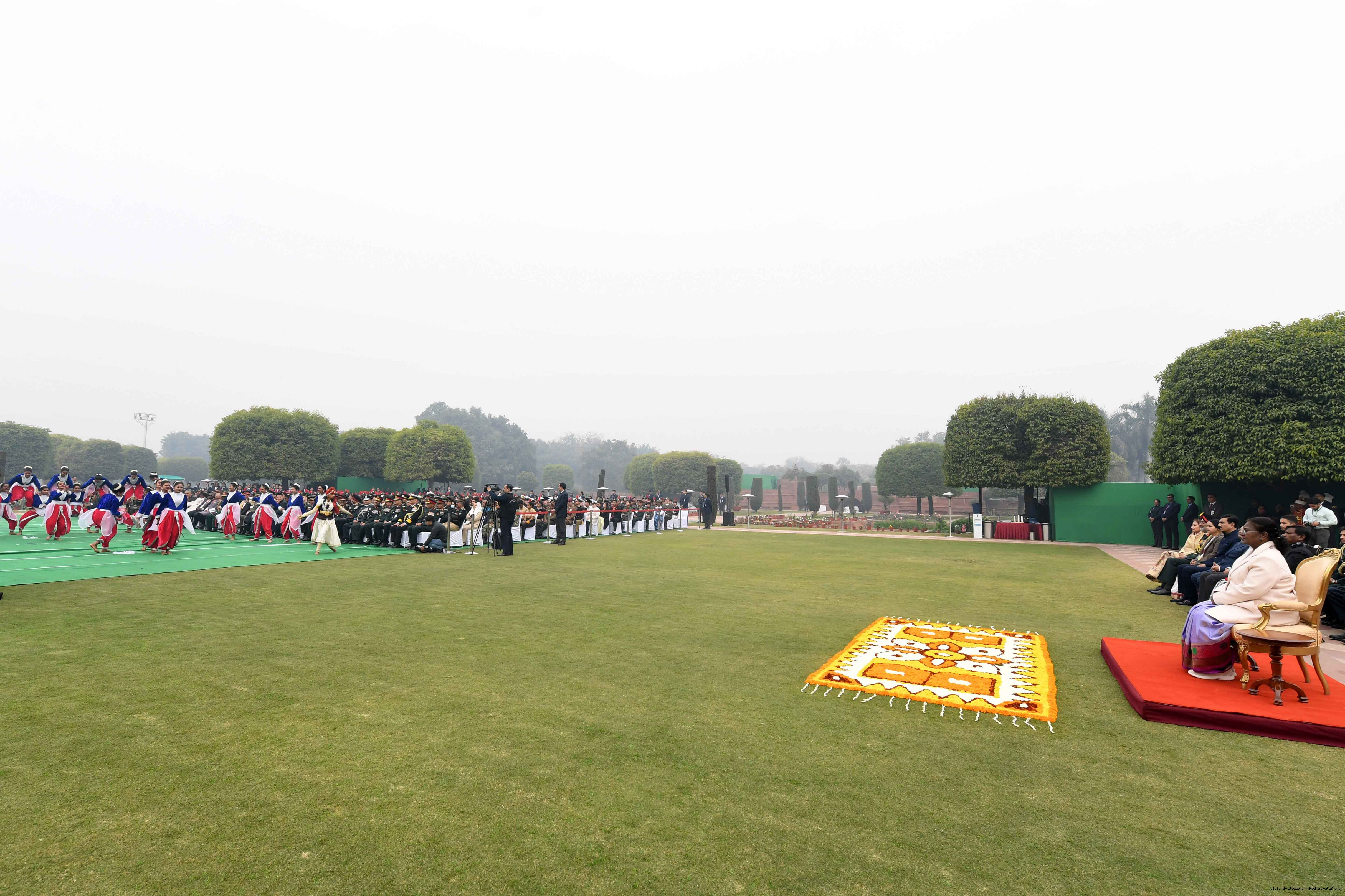The President of India, Smt. Droupadi Murmu met tribal guests, tableaux artistes and tractor drivers, NSS volunteers and NCC cadets, officials and other participants of the Republic Day Parade 2024, at Rashtrapati Bhavan on January 28, 2024.