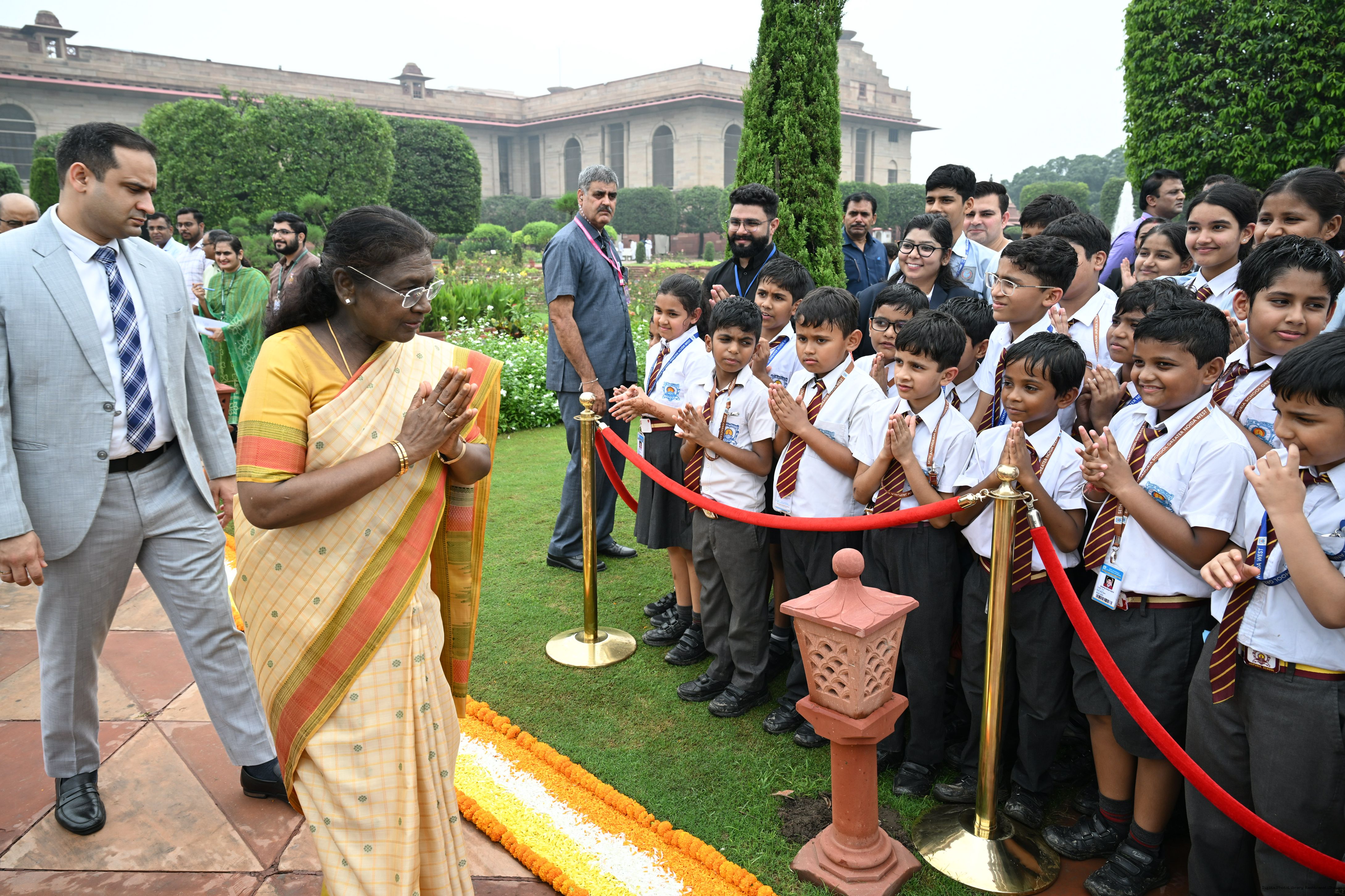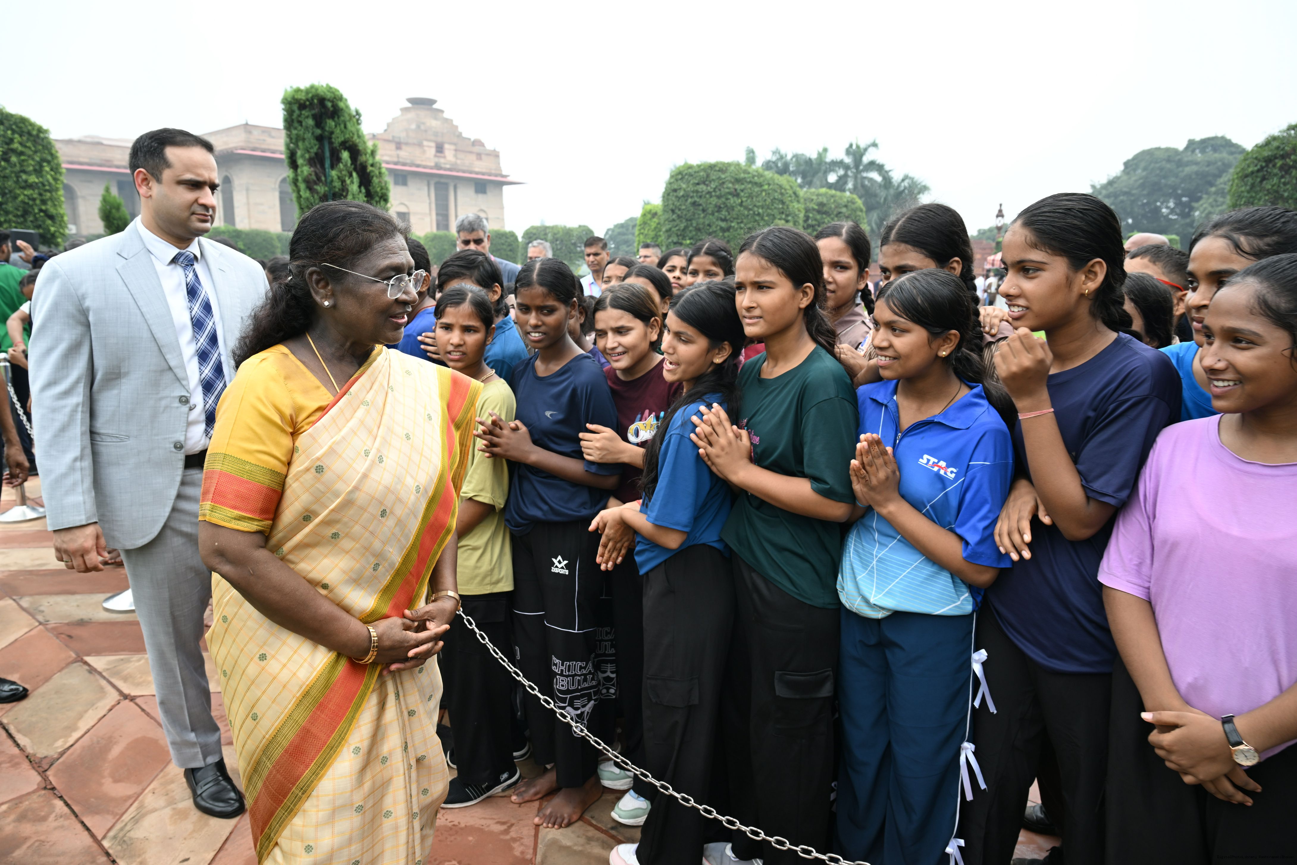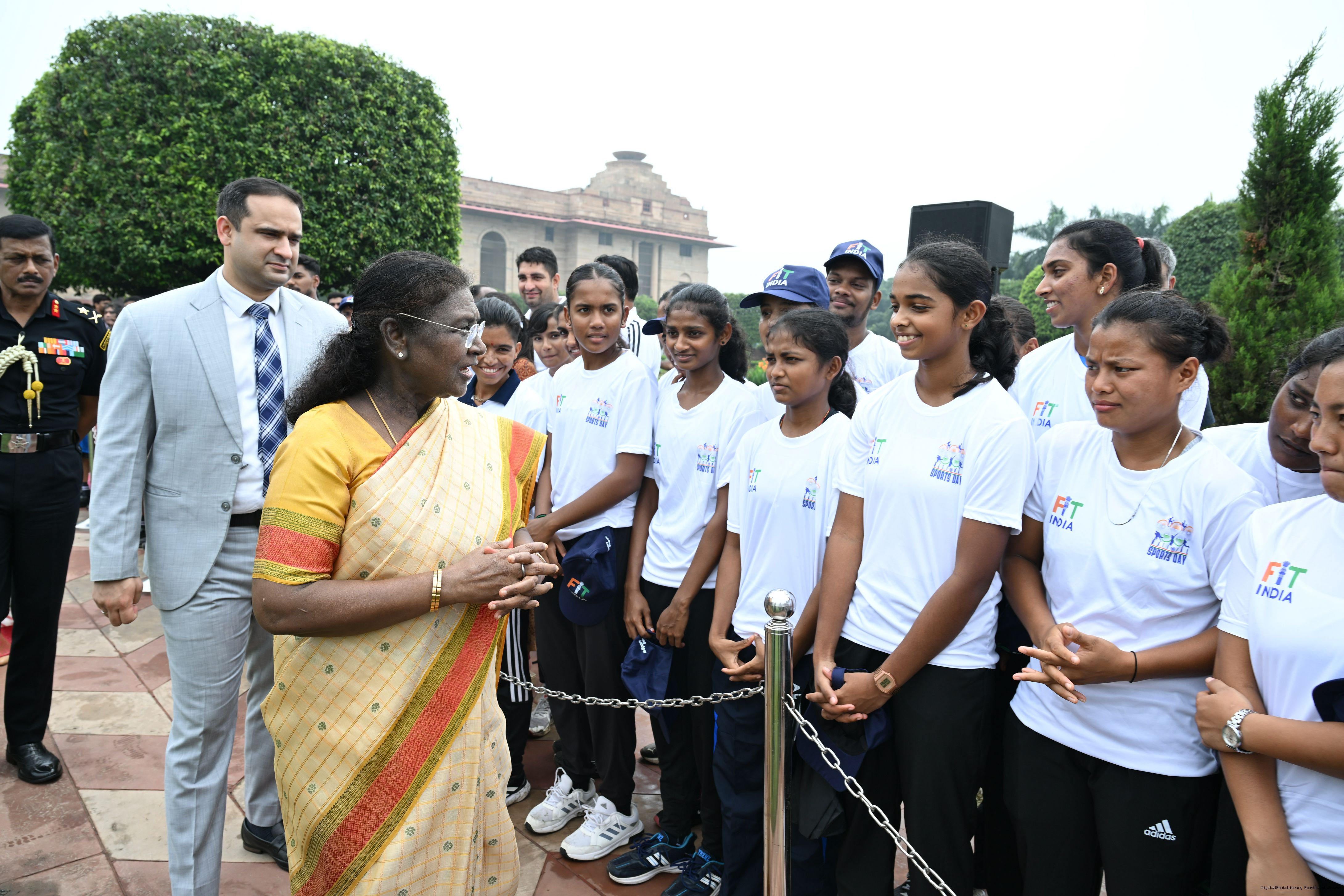The President of India, Smt Droupadi Murmu interacted with sportspersons who visited Amrit Udyan on National Sports Day at Rashtrapati Bhavan on August 29, 2025.
