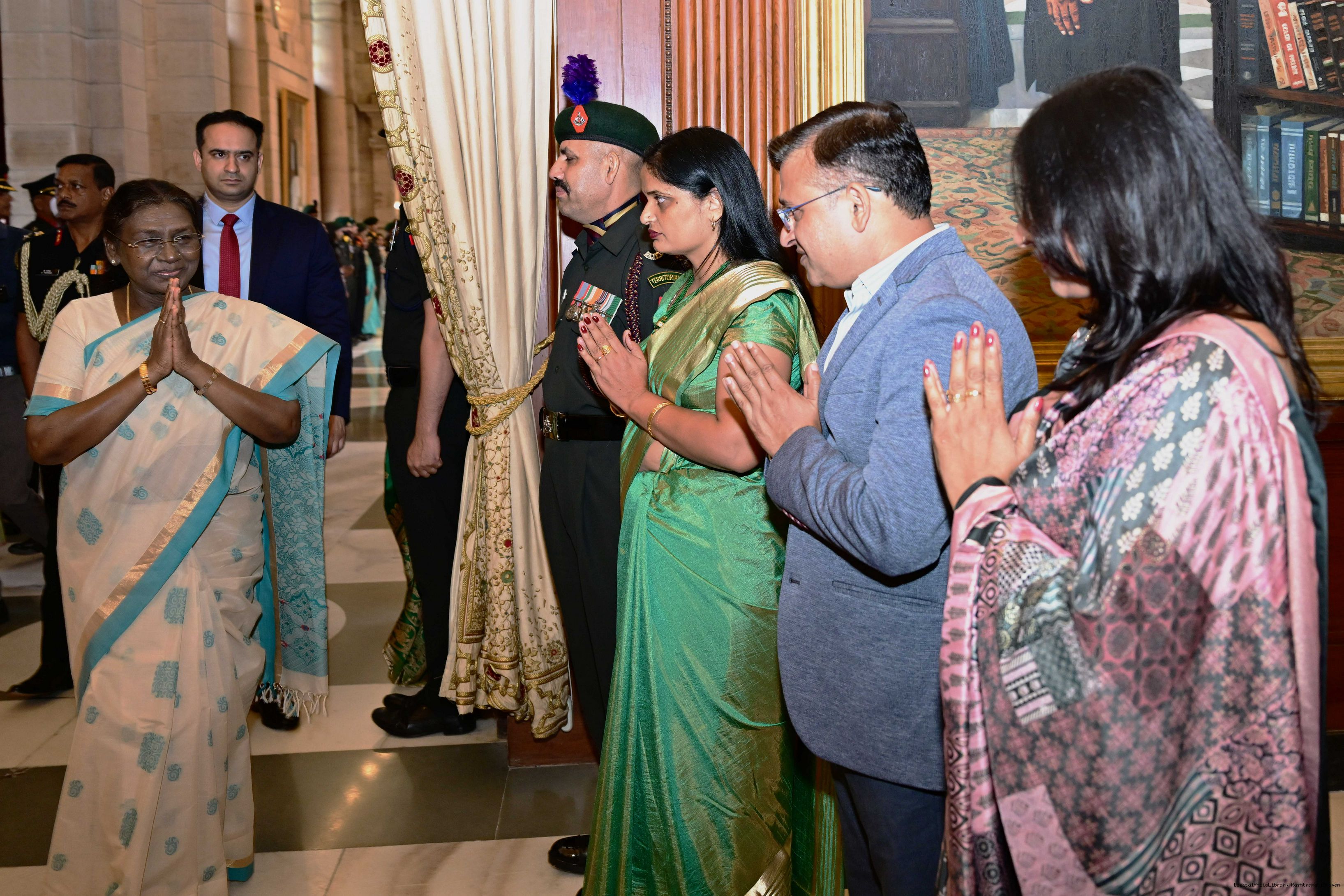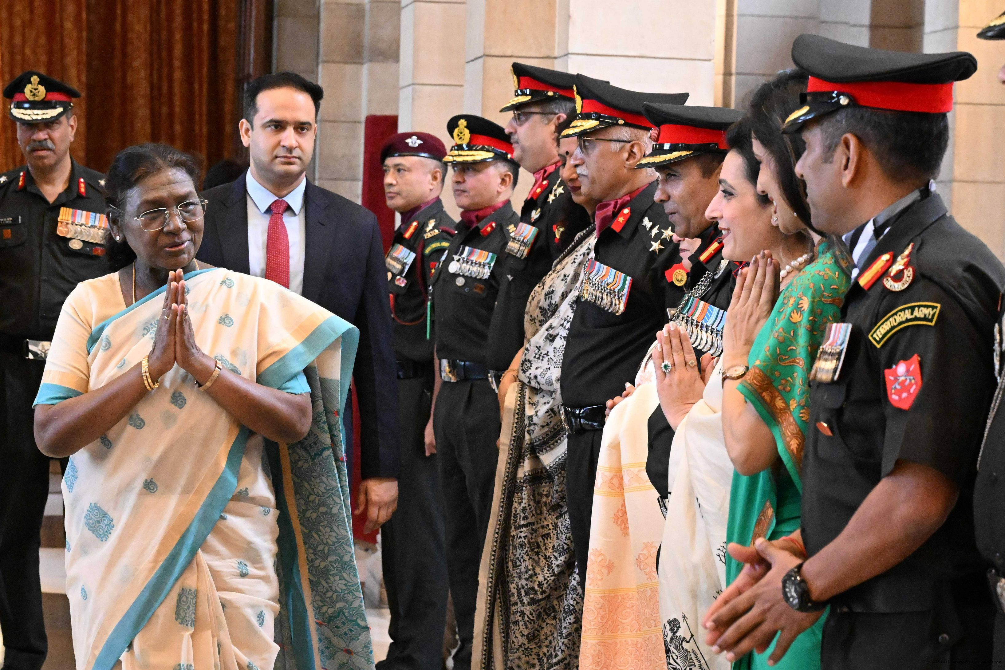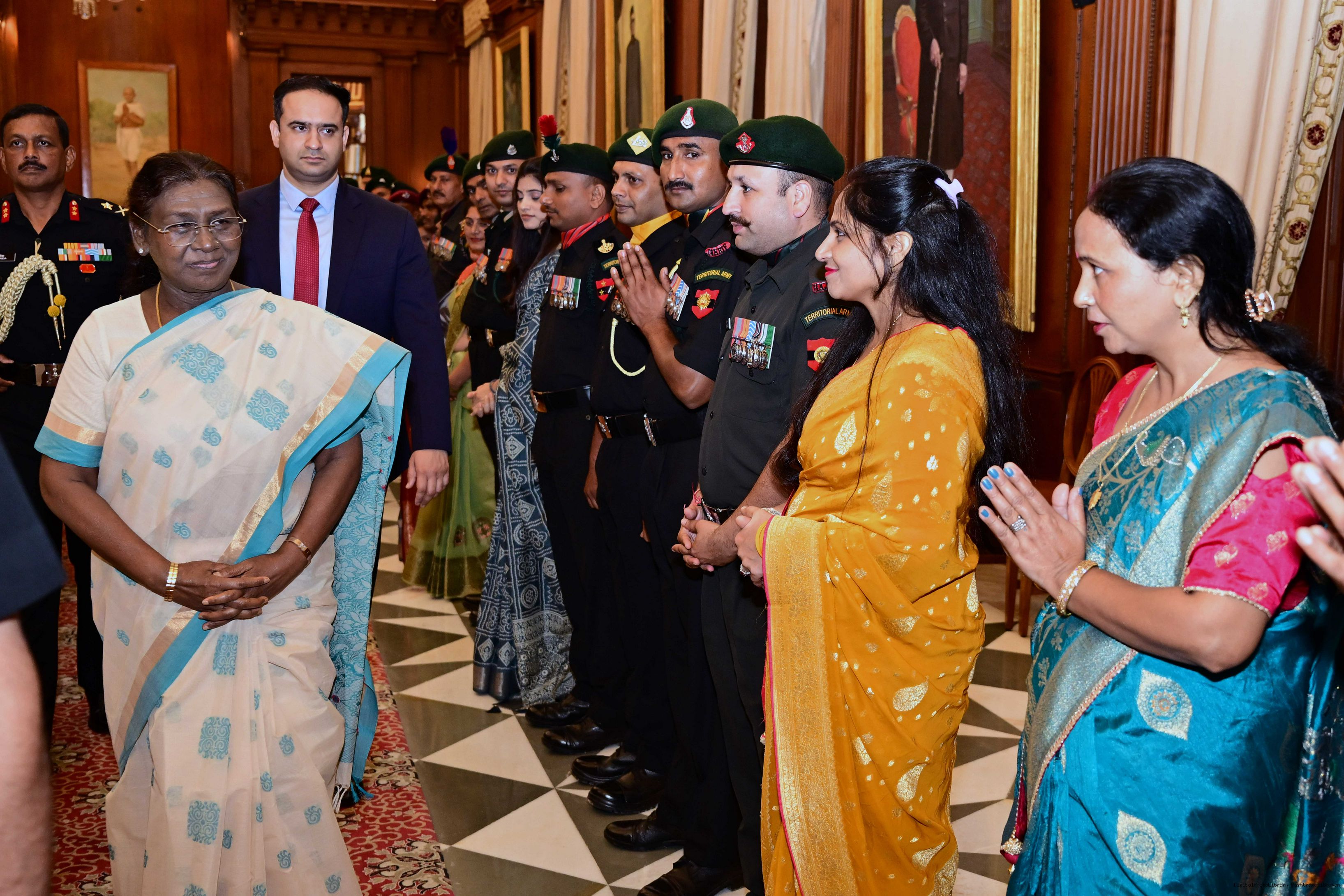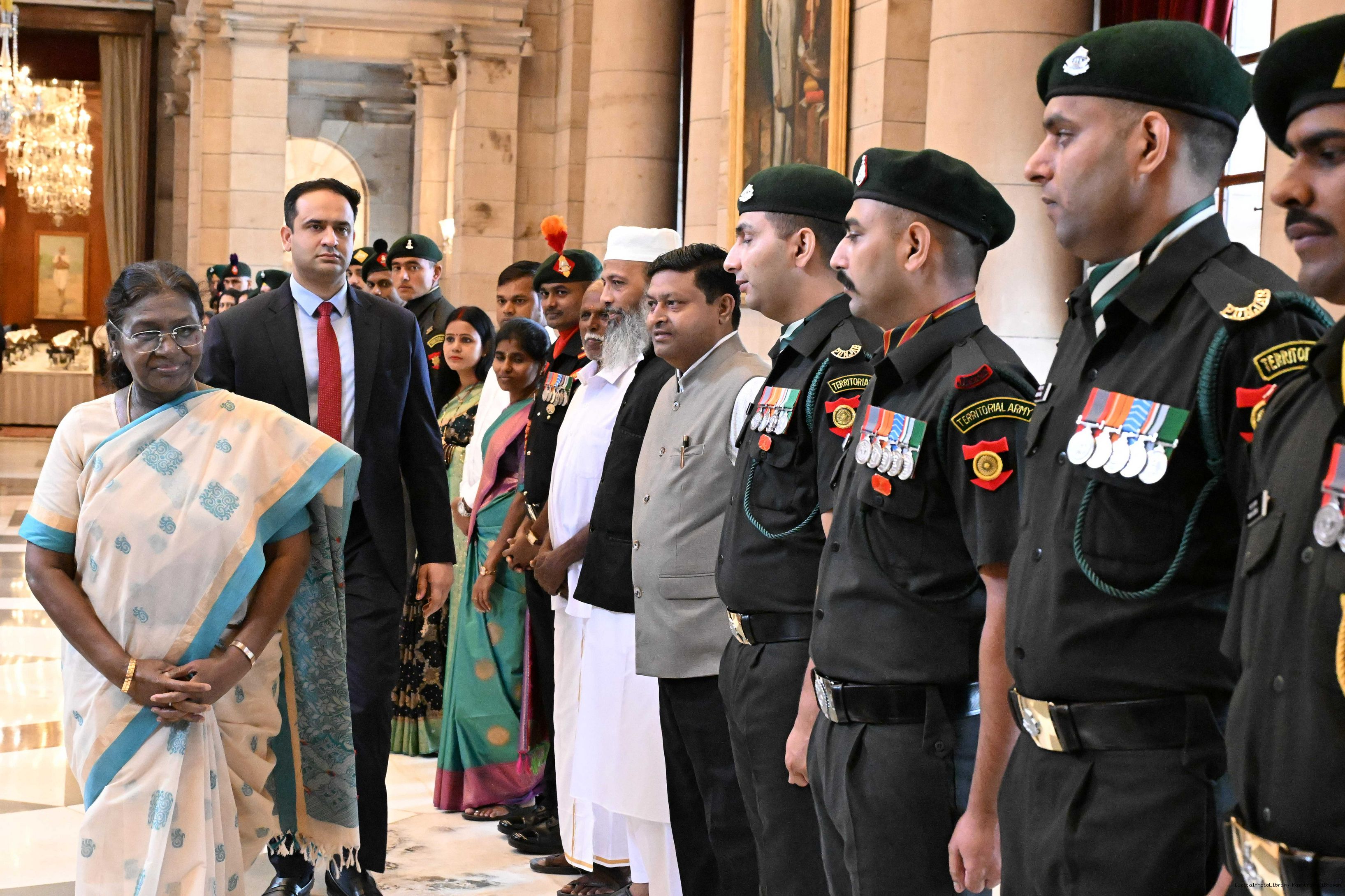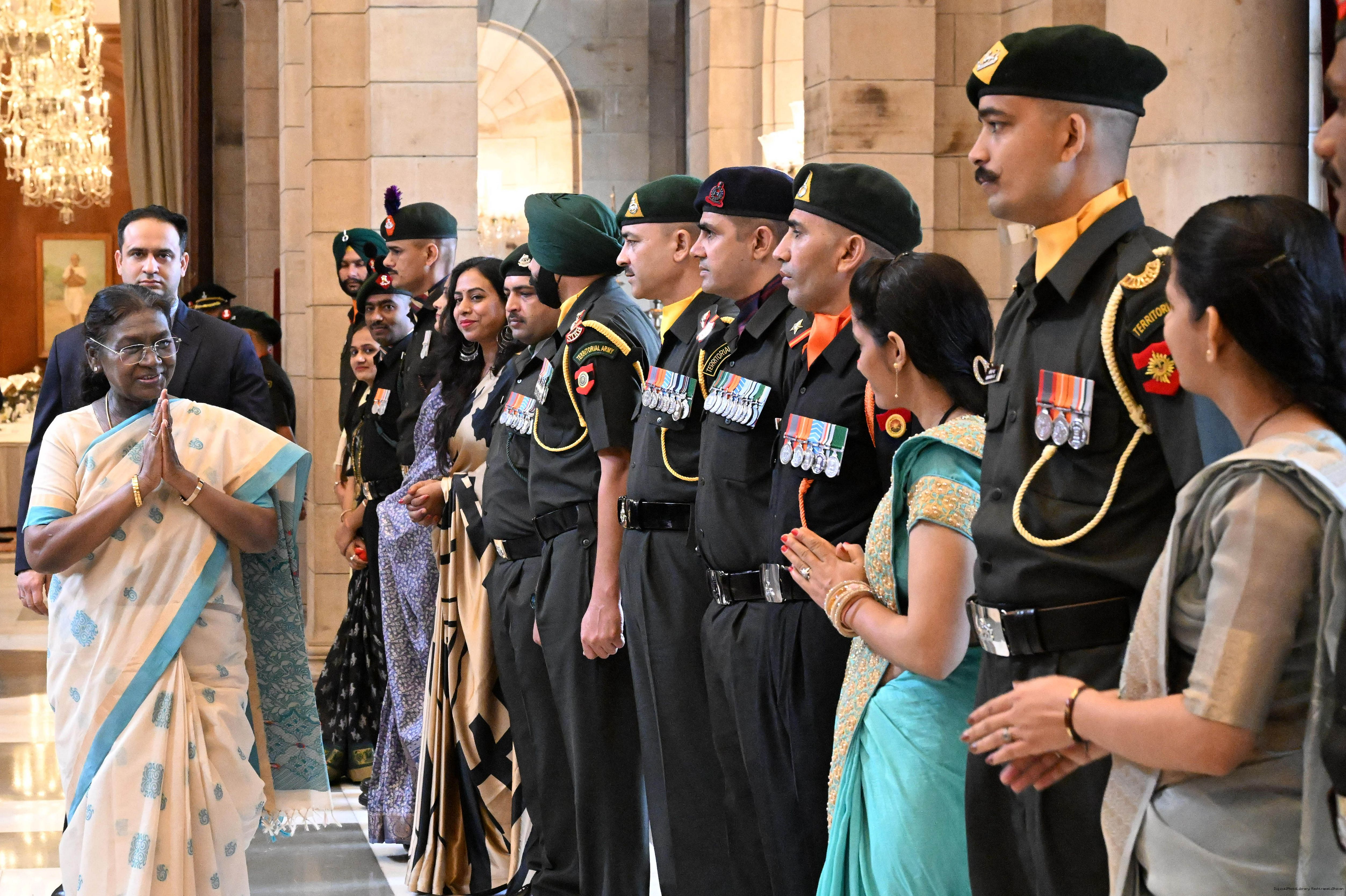 The President of India, Smt. Droupadi Murmu interacted and met Territorial Army (TA) Officers, JCOs and Ors and their families with selected civilian staff of the Territorial Army Directorate at Rashtrapati Bhavan on October 8, 2025.