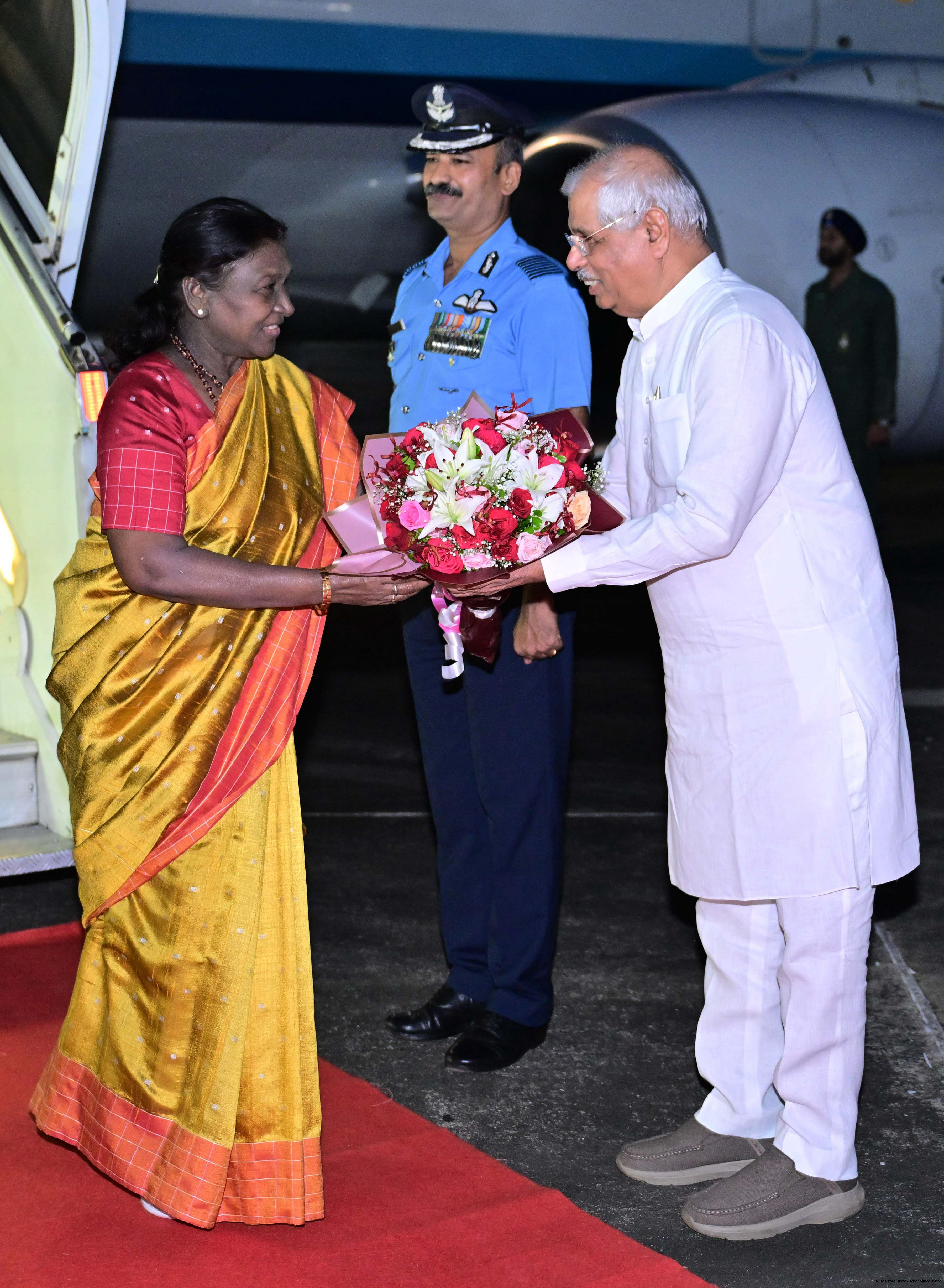 The Governor of Kerala, Shri Rajendra Vishwanath Arlekar, Chief Minister Shri Pinarayi Vijayan and Union Minister of State for Minority Affairs and Fisheries, Animal Husbandry Dairying Shri George Kurian received the President of India, Smt. Droupadi Murmu on her arrival at Thiruvananthapuram on October 21, 2025.