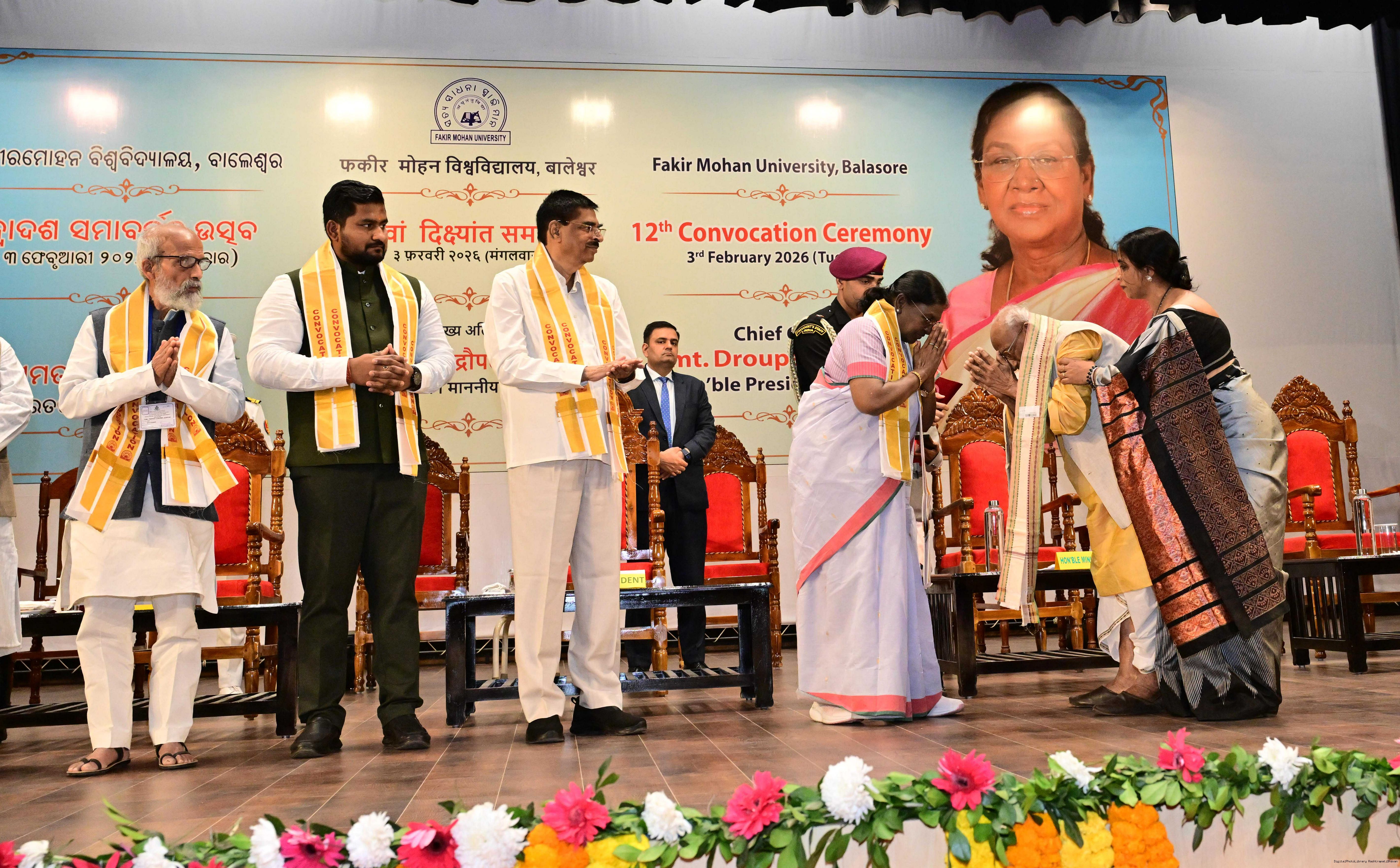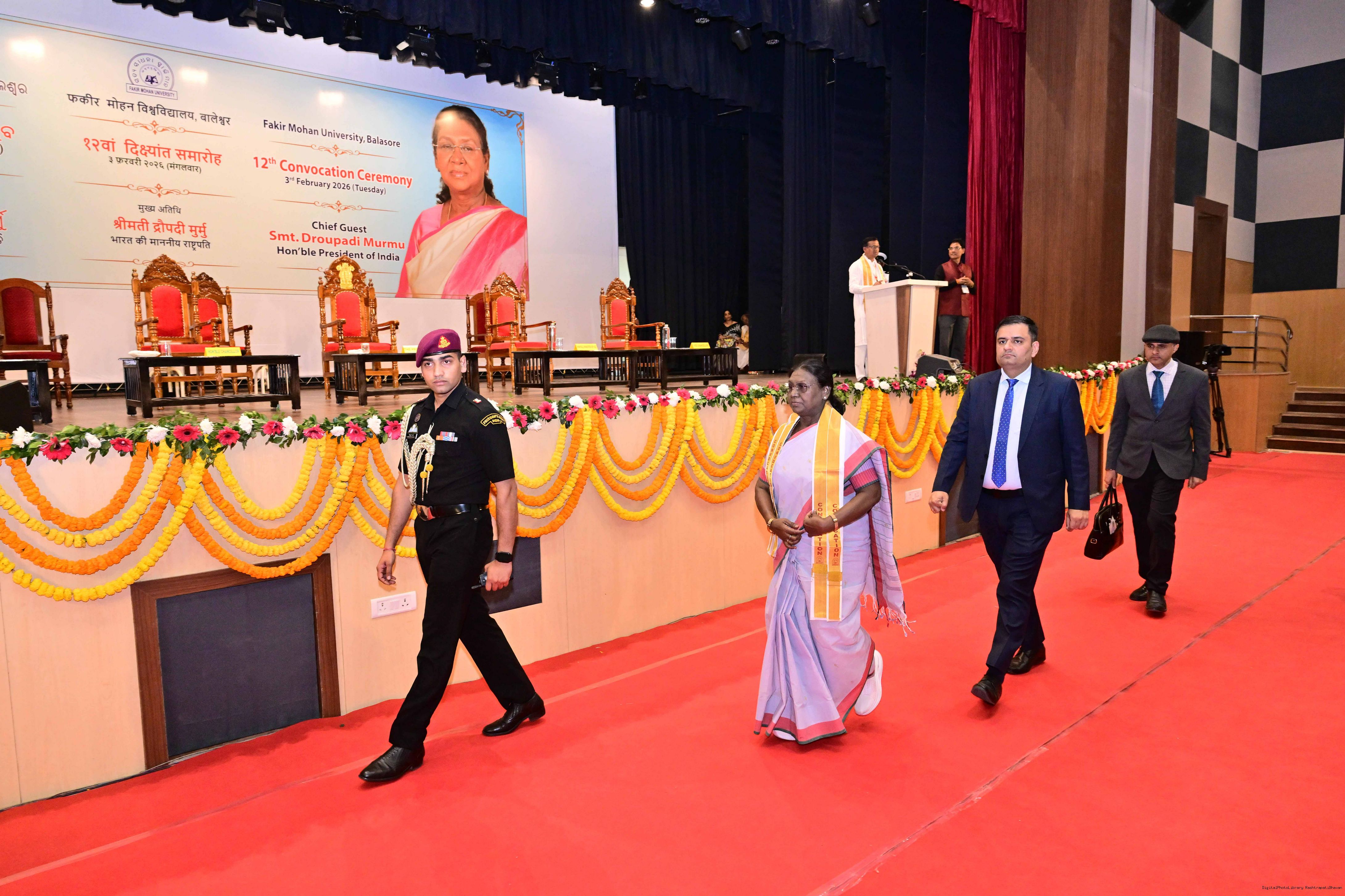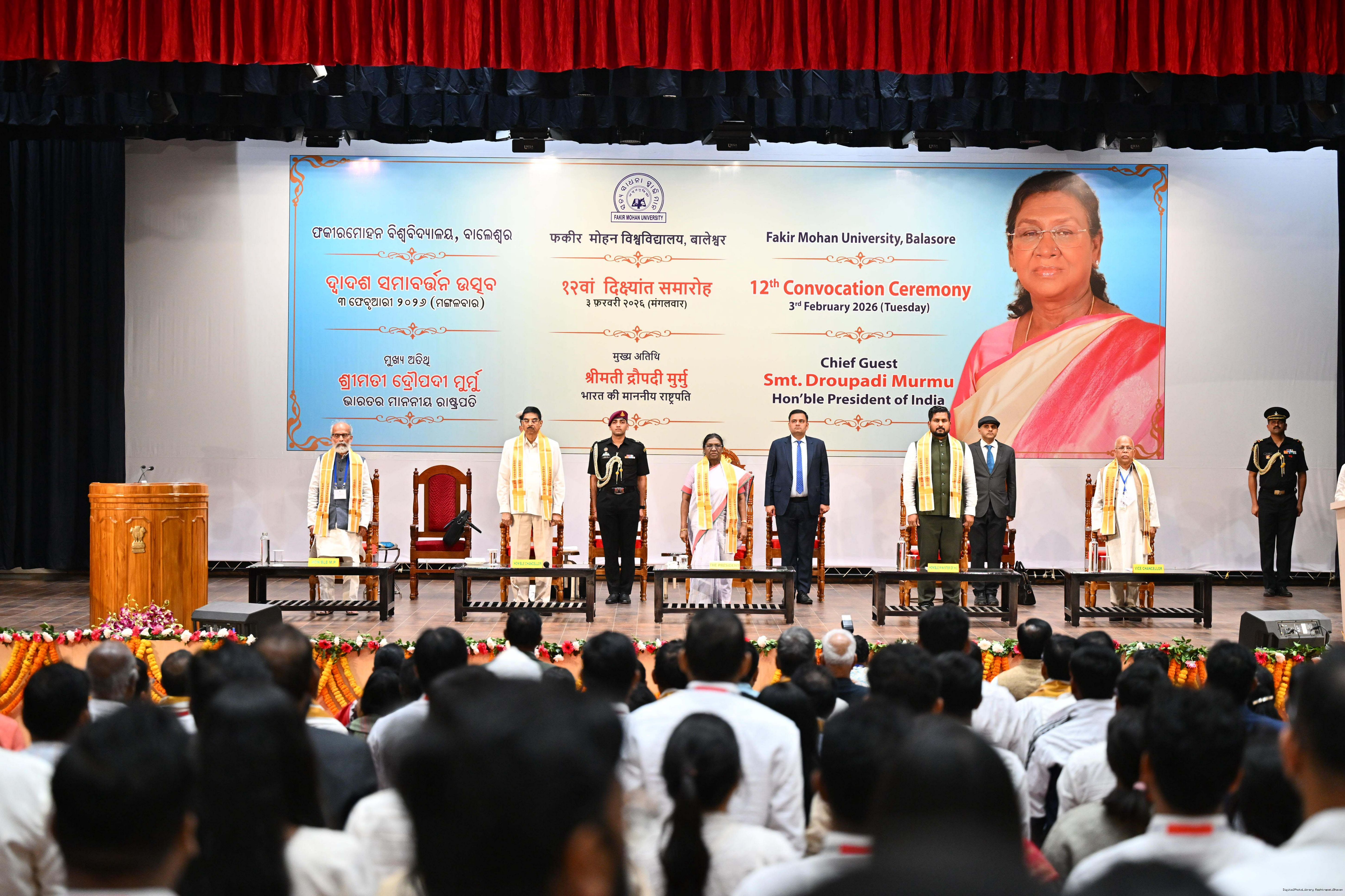 The President of India Smt Droupadi Murmu graced and addressed the convocation ceremony of Fakir Mohan University and inaugurated its new Auditorium at Balasore, Odisha on February 3, 2026.