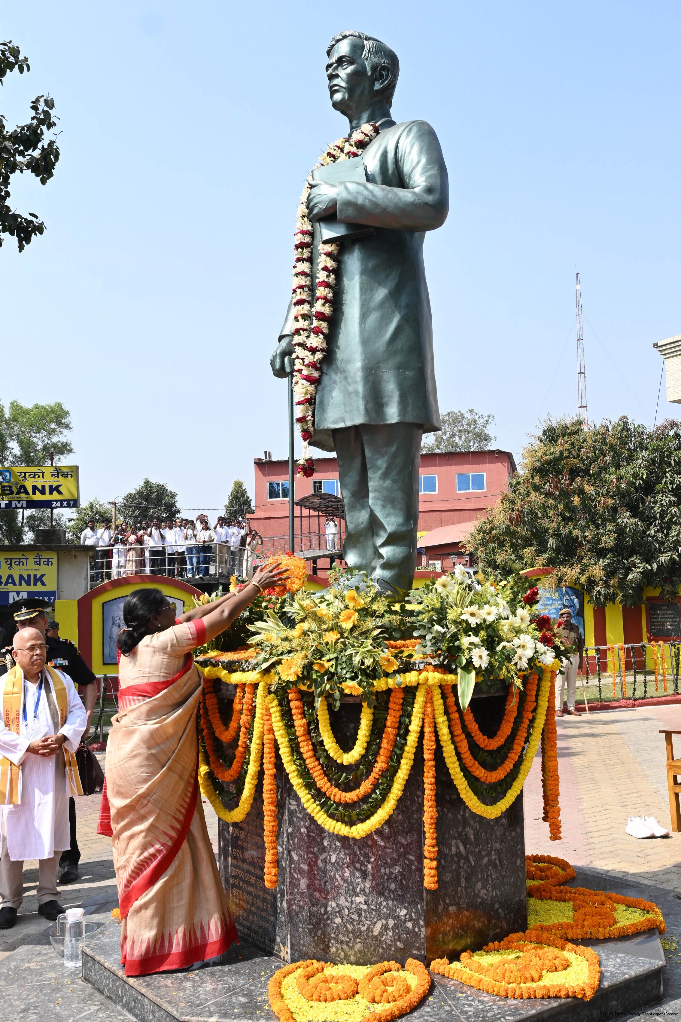 The President of India, Smt Droupadi Murmu paid floral tribute at the statue of fakir mohan senapati at the main gate of the university at Balasore, Odisha on February 3, 2026.