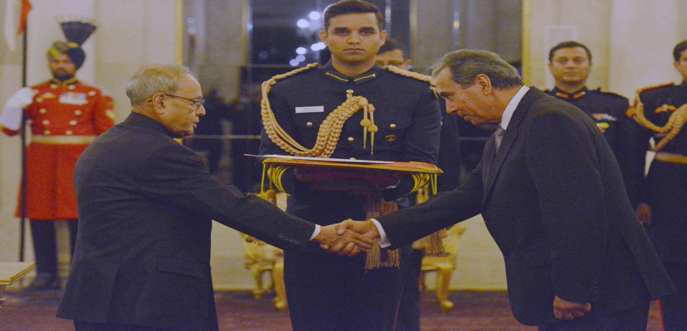 The High Commissioner-designate of Britain, H.E. Sir Dominic Asquith KCMG presenting his Credentials to the President of India, Shri Pranab Mukherjee, at Rashtrapati Bhavan on April 04, 2016.