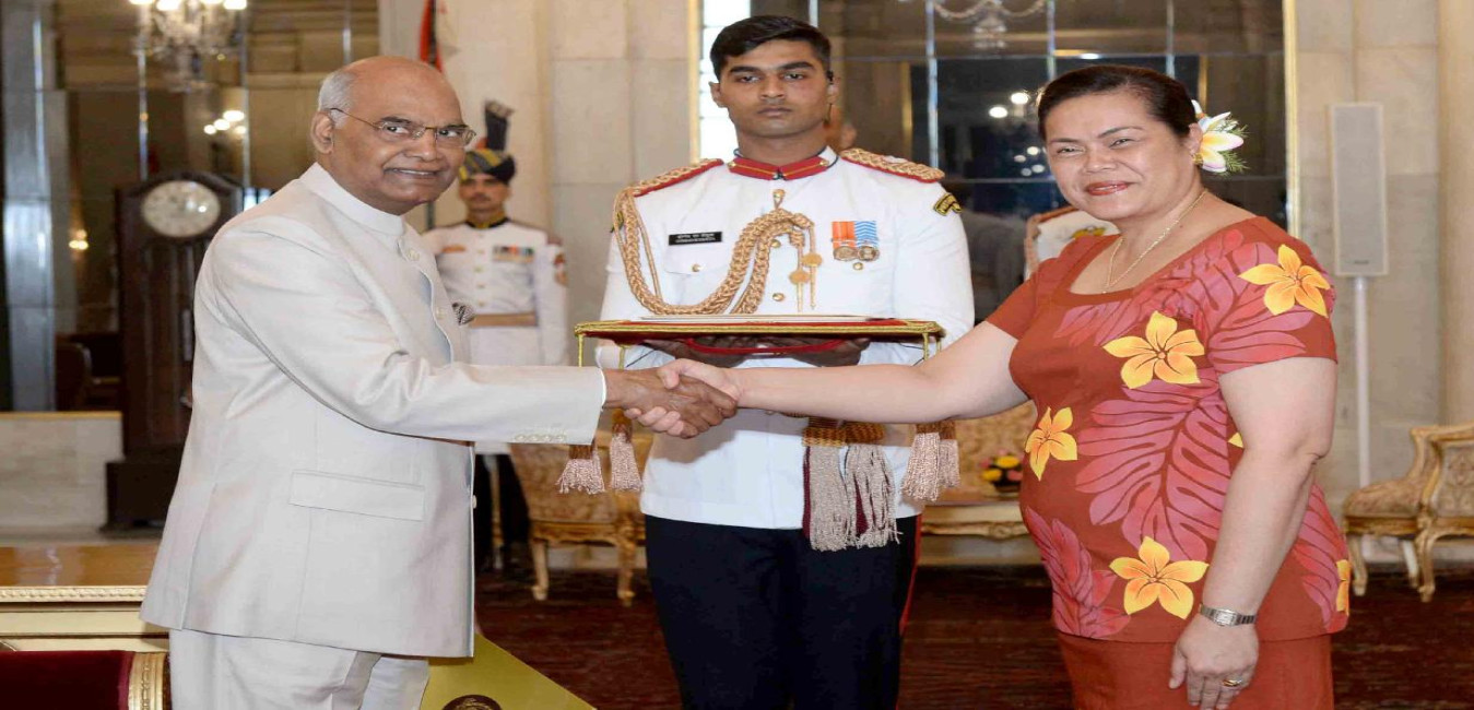The High Commissioner-designate of Independent State of Samoa, H.E. Ms. Faalavaau Perina Jaqueline Sila-Tualaulelei presenting her credentials to the President of India, Shri Ram Nath Kovind, at Rashtrapati Bhavan on May 31, 2018.