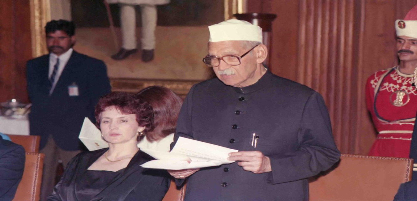 The President of India, Dr. Shankar Dayal Sharma hosting Banquet in honour of H.E. Mr. Maumoon Abdul Gayoom, President of the Republic of Maldives and Mrs. Nasreena M.A. Gayoom at Rashtrapati Bhavan in New Delhi on March 21, 1994.