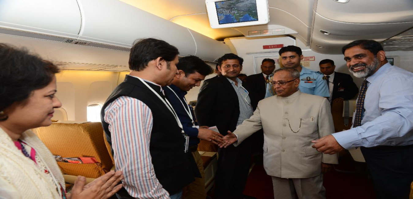 The President of India, Shri Pranab Mukherjee interacting with his Official Delegation and Accompanying Media Delegation on his way to State Visit to Vietnam at Hanoi in Vietnam on Sep 14, 2014