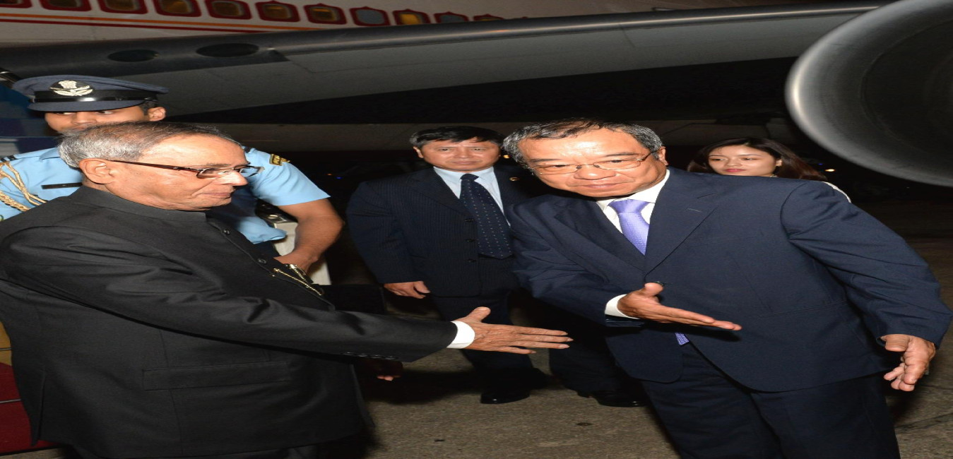 The President of India, Shri Pranab Mukherjee being received at Hanoi Airport during his visit to the Socialist Republic of Vietnam in Vietnam on Sep 14, 2014