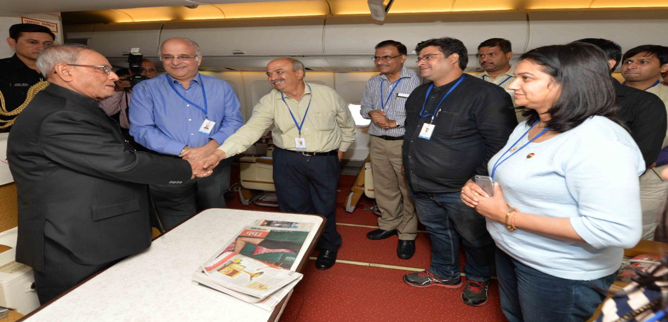 The President of India, Shri Pranab Mukherjee interacting with media delegation, on board Air India special aircraft, on his way back to Delhi after the State Visits of Sweden and the Republic of Belarus on June 04, 2015