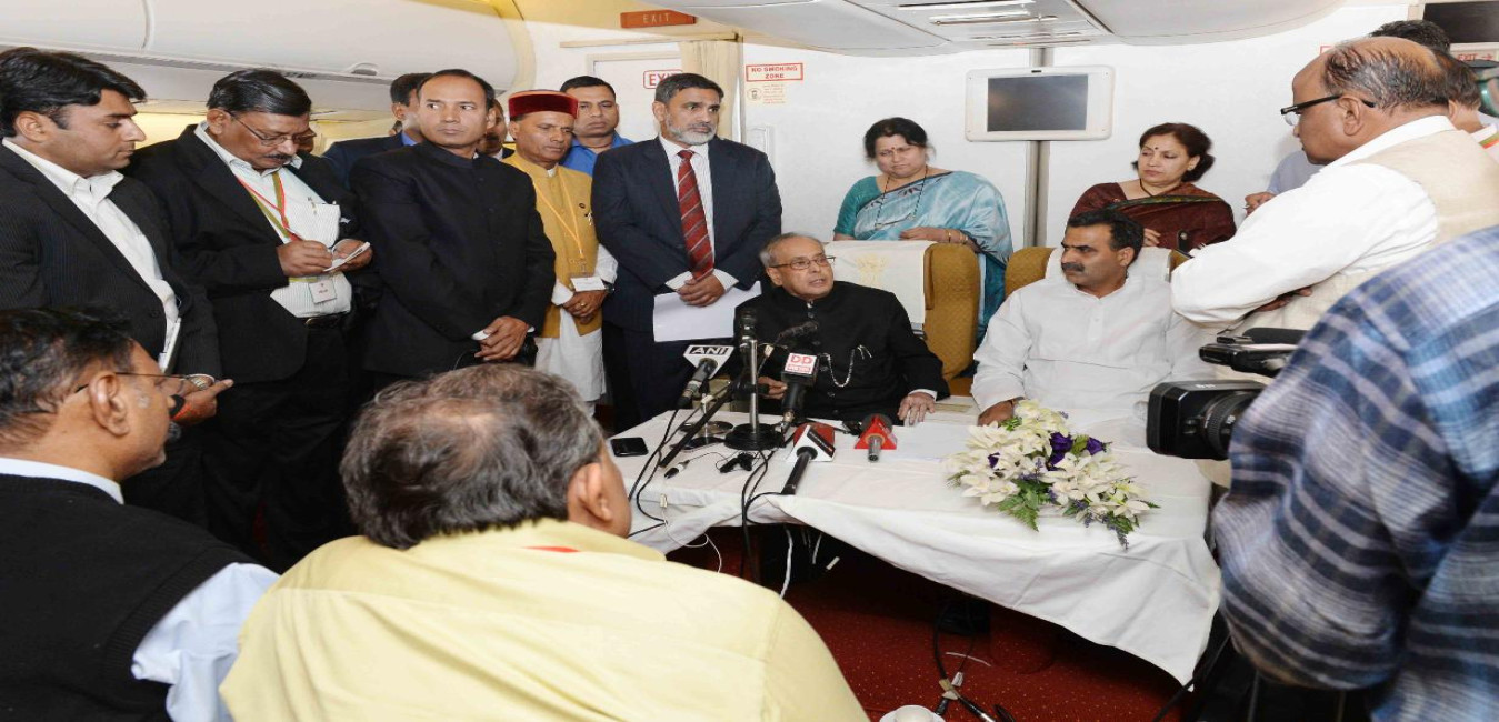 The President of India, Shri Pranab Mukherjee interacting with the media delegation, on board the Air India special aircraft, on his way back to India after his State Visits to Papua New Guinea and New Zealand on May 02, 2016.
