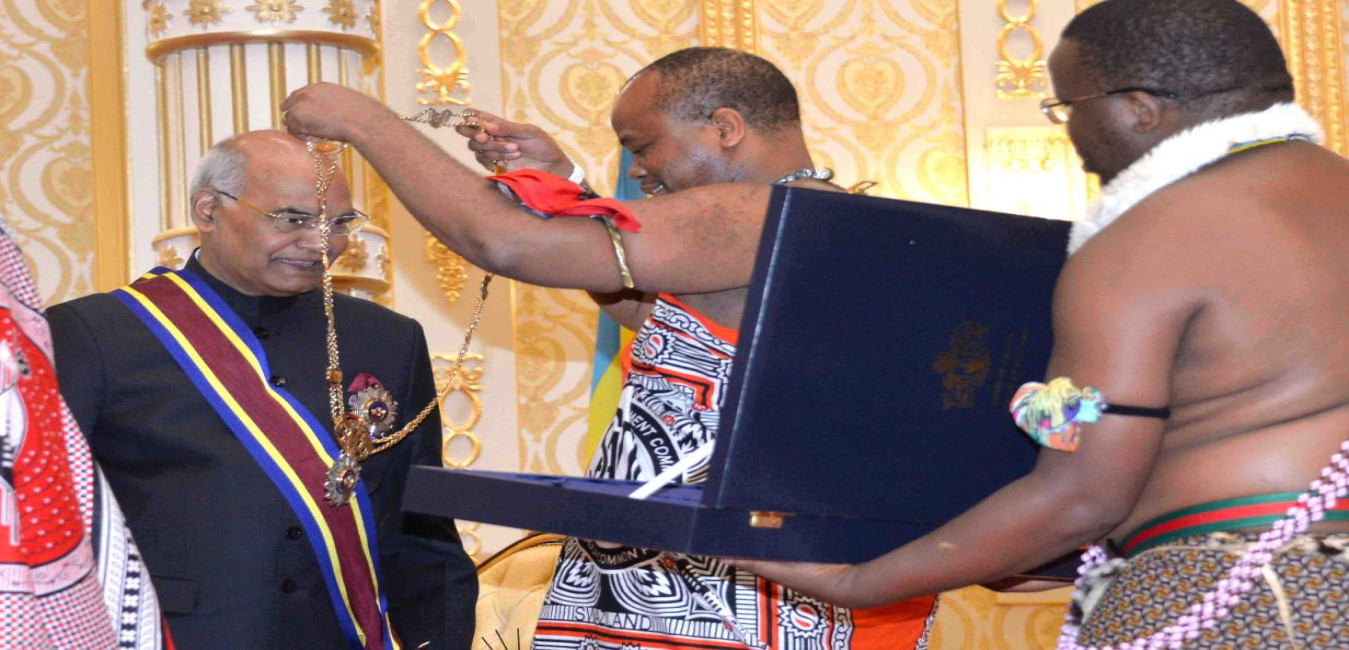 The President of India, Shri Ram Nath Kovind receiving the order of Lion from His Majesty Mswati III, the King of Swaziland, at Lozitha Palace, in Swaziland on April 09, 2018.