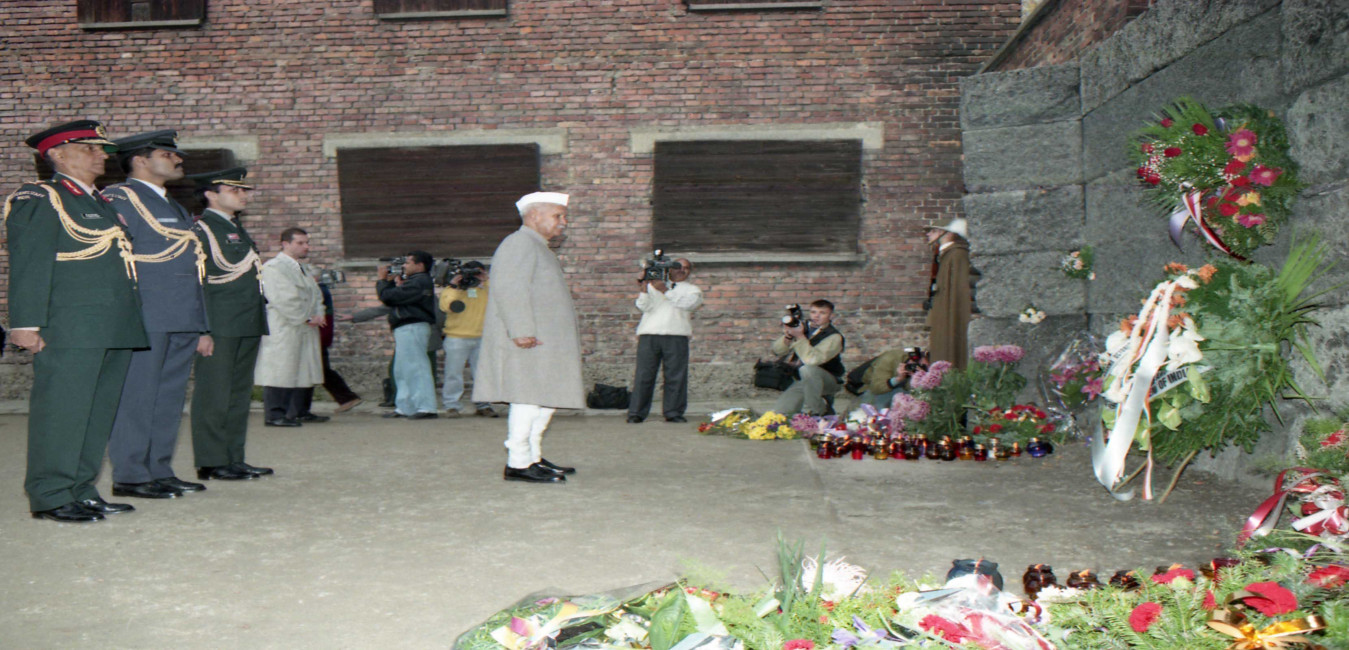 The President of India, Dr. Shankar Dayal Sharma laying wreath at the Wall of Death, at former Auschwitz Concentration Camp, Oswiecim, in Warsaw, Poland on October 08, 1996.