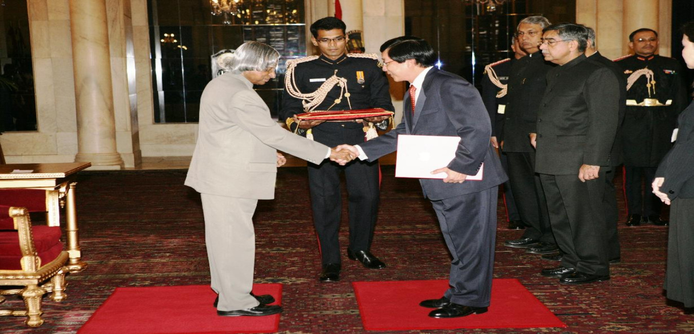 The High Commissioner-Designate of the Republic of Singapore to India, HE Mr Calvin Eu Mun Hoo presenting his credentials to the President of India, Dr A P J Abdul Kalam at the Ashok Hall of Rashtrapati Bhavan in New Delhi on Nov 13, 2006