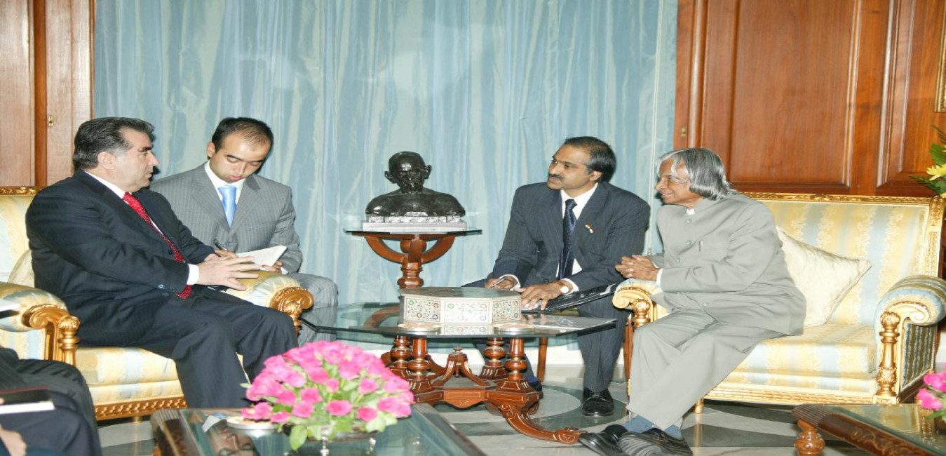 The President of Tajikistan, His Excellency Mr Emomalii Sharifovich Rahmonov calling on the President of India, Dr A P J Abdul Kalam at the North Drawing Room of Rashtrapati Bhavan in New Delhi on Aug 07, 2006