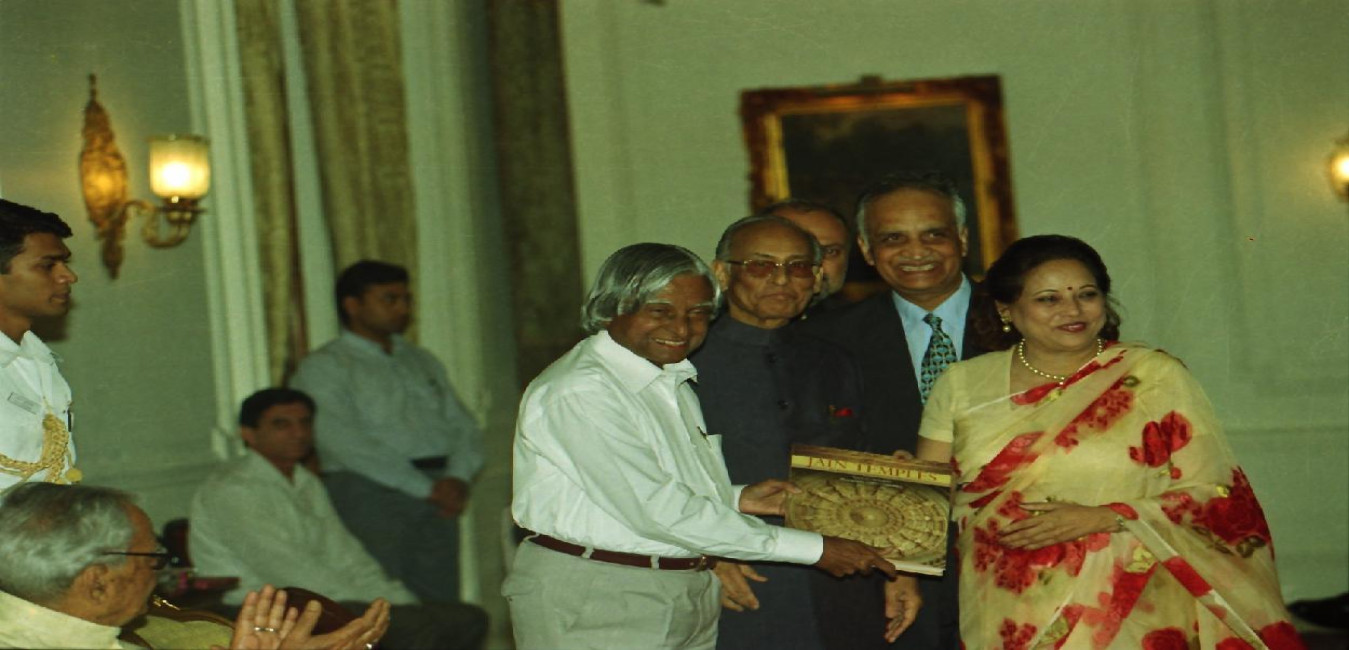 The President of India, Dr A P J Abdul Kalam receiving a Copy each of Four Books ''A Diplomatic Sojourn'', ''Democracy and Rule of Law'', ''Towards Global Togetherness'' and ''Jain Temples in Indian and Around the World: Art and Architecture'' from Dr L M Singhvi, MP (RS) at the Yellow Drawing Room of Rashtrapati Bhavan in New Delhi on Sep 26, 2002