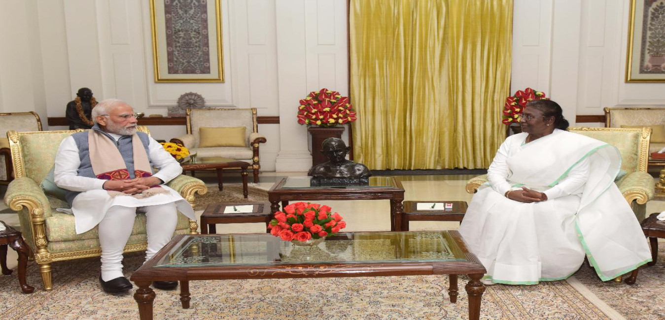 The Prime Minister of India, Shri Narendra Modi called on the President of India, Smt. Droupadi Murmu, at Rashtrapati Bhavan on July 26, 2022, first time after her assumption of office on July 25, 2022.
