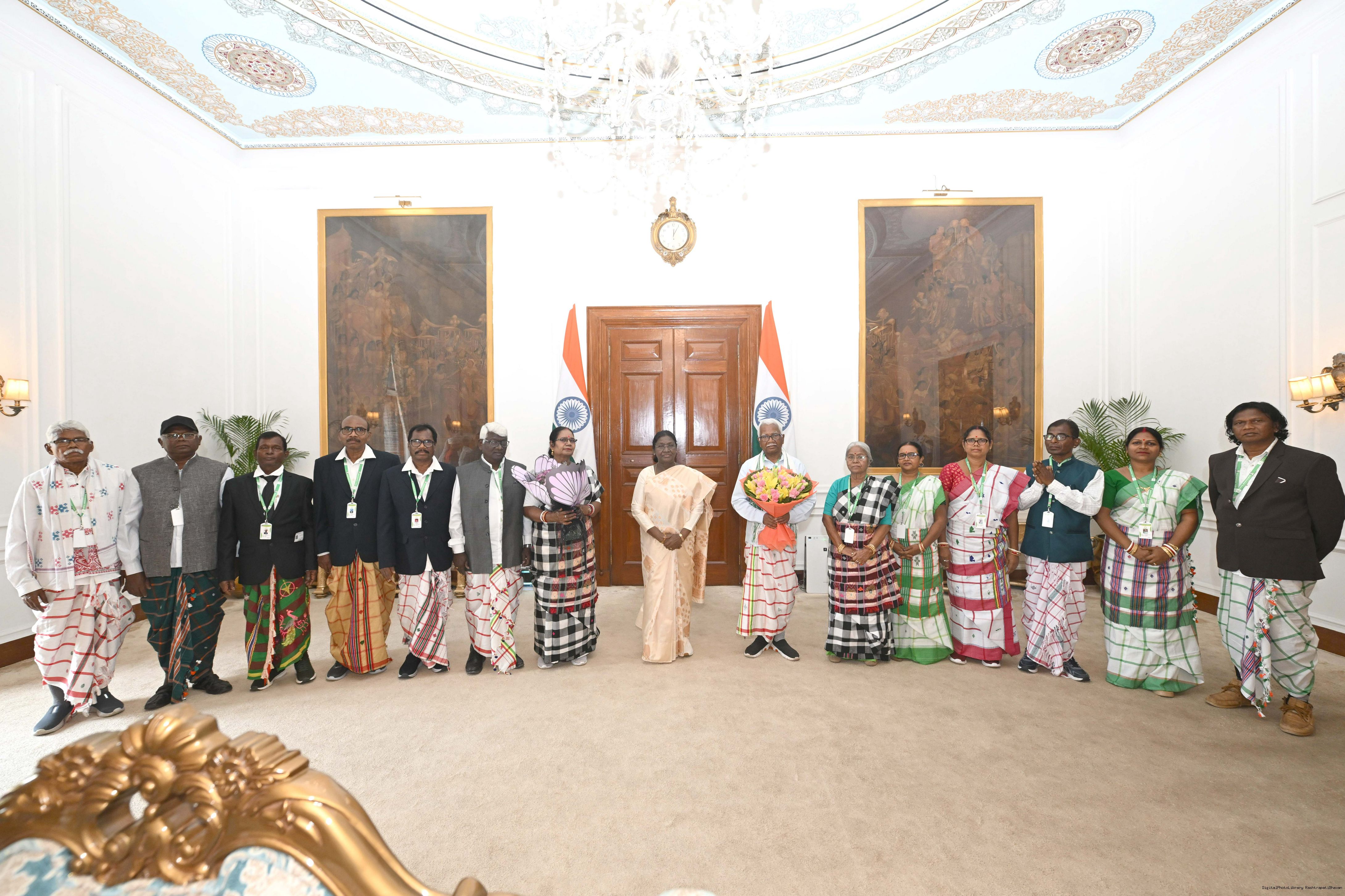 Shri Rupendra Nath Murmu, General Secrtetary, Adibasi Socio-Educational and Cultural Association, Bhubaneswar along with Shri Unday Nath Majhi and others meeting with the President of India, Smt Droupadi Murmu at Rashtrapati Bhavan on April 8, 2026.