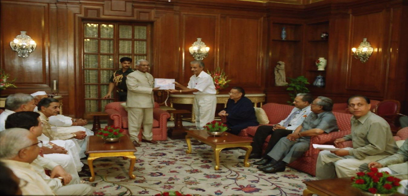 The President of India, Shri K R Narayanan with the Members of Shri Dharmic Leela Committee Parade Ground at the Committee Room of Rashtrapati Bhavan in New Delhi on Oct 16, 2001