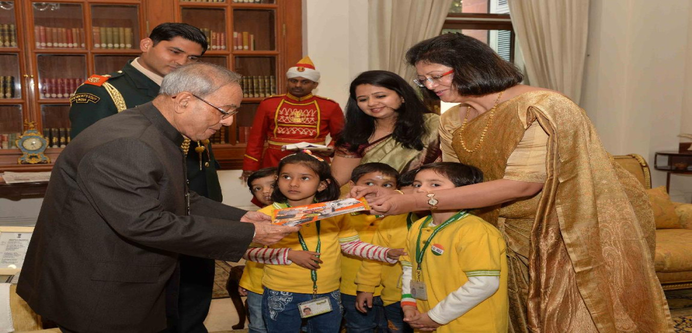 The President of India, Shri Pranab Mukherjee meeting with Smt. Amita Uday Lalit, wife of Shri Justice Uday Lalit, Judge, Supreme Court of India alongwith Smt. Sheetal Sharma and students from Stimulus Preschool, Noida, at Rashtrapati Bhavan on February 16, 2016.