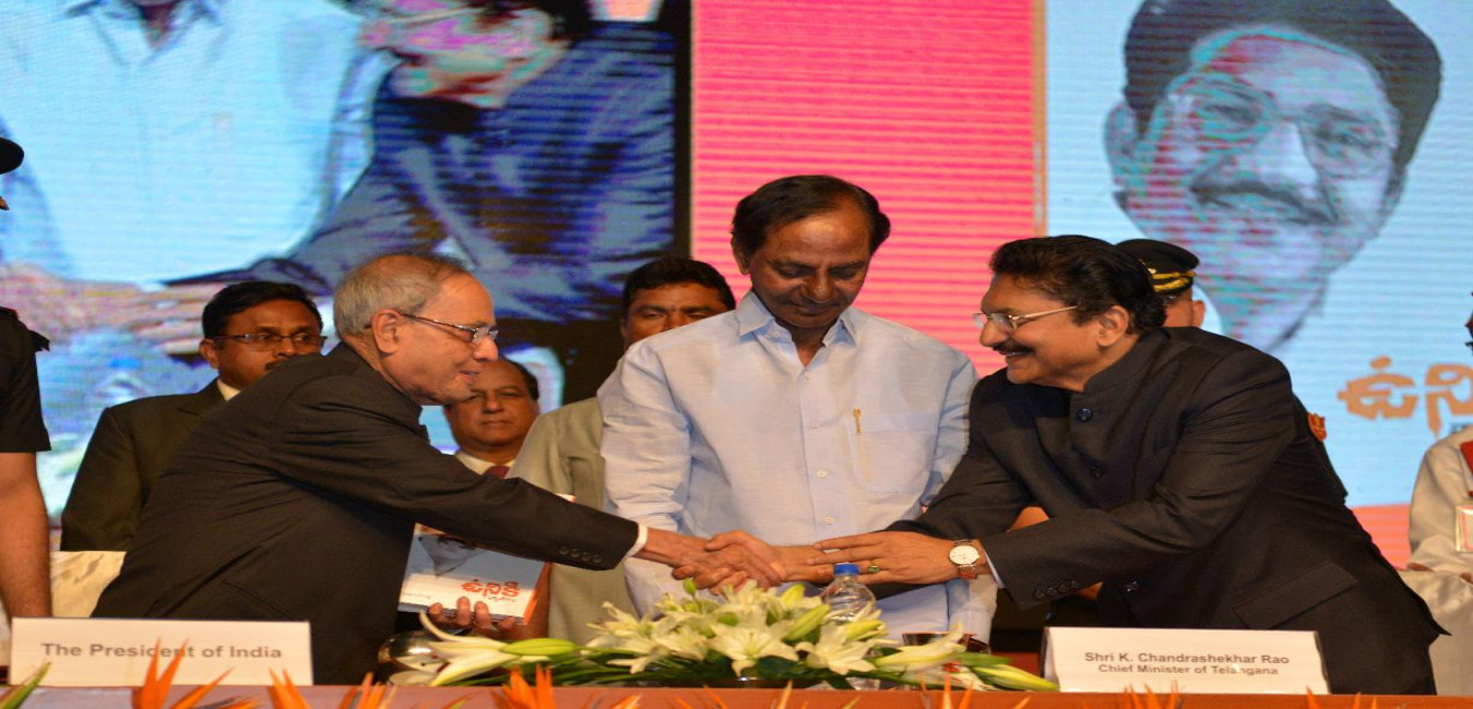 The President of India, Shri Pranab Mukherjee receiving the first copy of the book Uniki from the Chief Minister of Telangana, Shri K Chandrashekar Rao, at a function, in Hyderabad on July 03, 2015. The Governor of Maharashtra, Shri Chennamaneni Vidyasagar Rao and the Governor of Andhra Pradesh and Telangana, Shri ESL Narasimhan are also seen.
