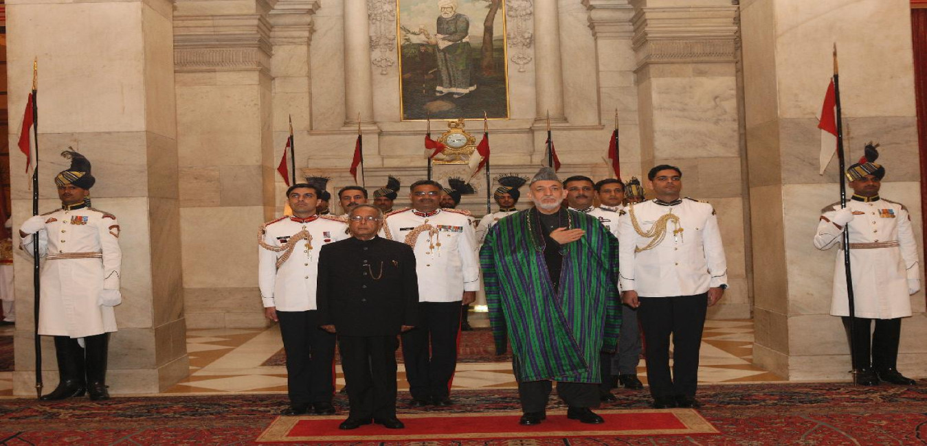 The President of India, Shri Pranab Mukherjee receives HE Mr Hamid Karzai, President of the Islamic Republic of Afghanistan during his Ceremonial Reception at Rashtrapati Bhavan on November 12, 2012