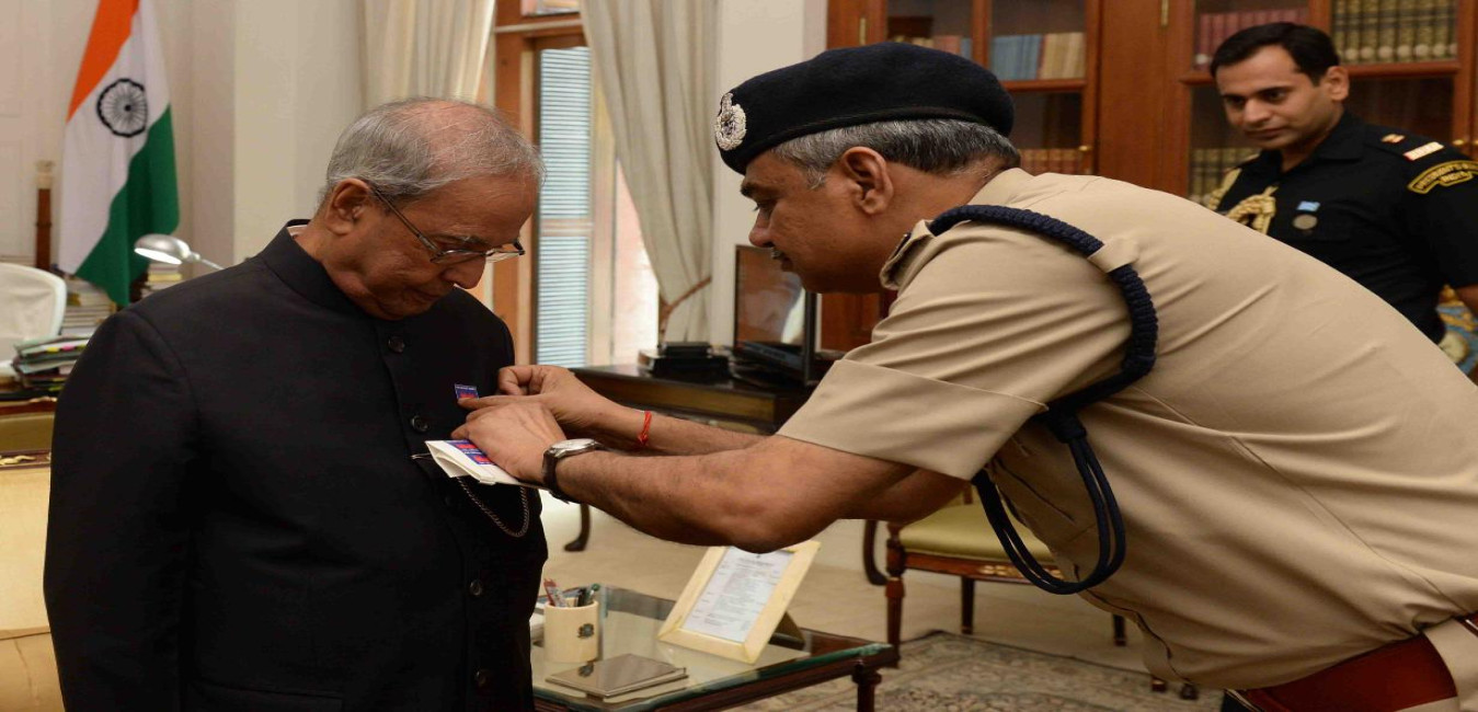 The President of India, Shri Pranab Mukherjee being pinned a flag by Shri G.C. Misra, Director with other officers from Delhi Fire Service on the occasion of Fire Service Week, at Rashtrapati Bhavan on April 18, 2017.