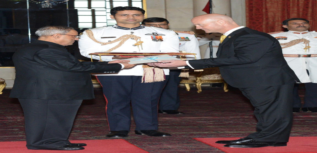 The Ambassador of Guatemala, His Excellency Mr Georges de La Roche Du Ronzet Plihal presenting his credentials to the President of India, Shri Pranab Mukherjee at Rashtrapati Bhavan in New Delhi on April 02, 2014