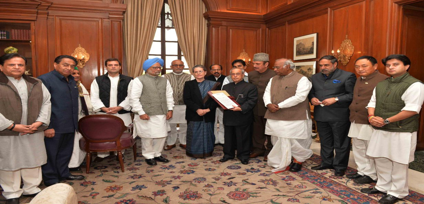 The President of India, Shri Pranab Mukherjee meeting with a delegation led by Shri Ghulam Nabi Azad, Leader of Opposition in Rajya Sabha and Shri Mallikarjun Kharge, Leader of Congress Party in Lok Sabha, at Rashtrapati Bhavan on December 16, 2015.
