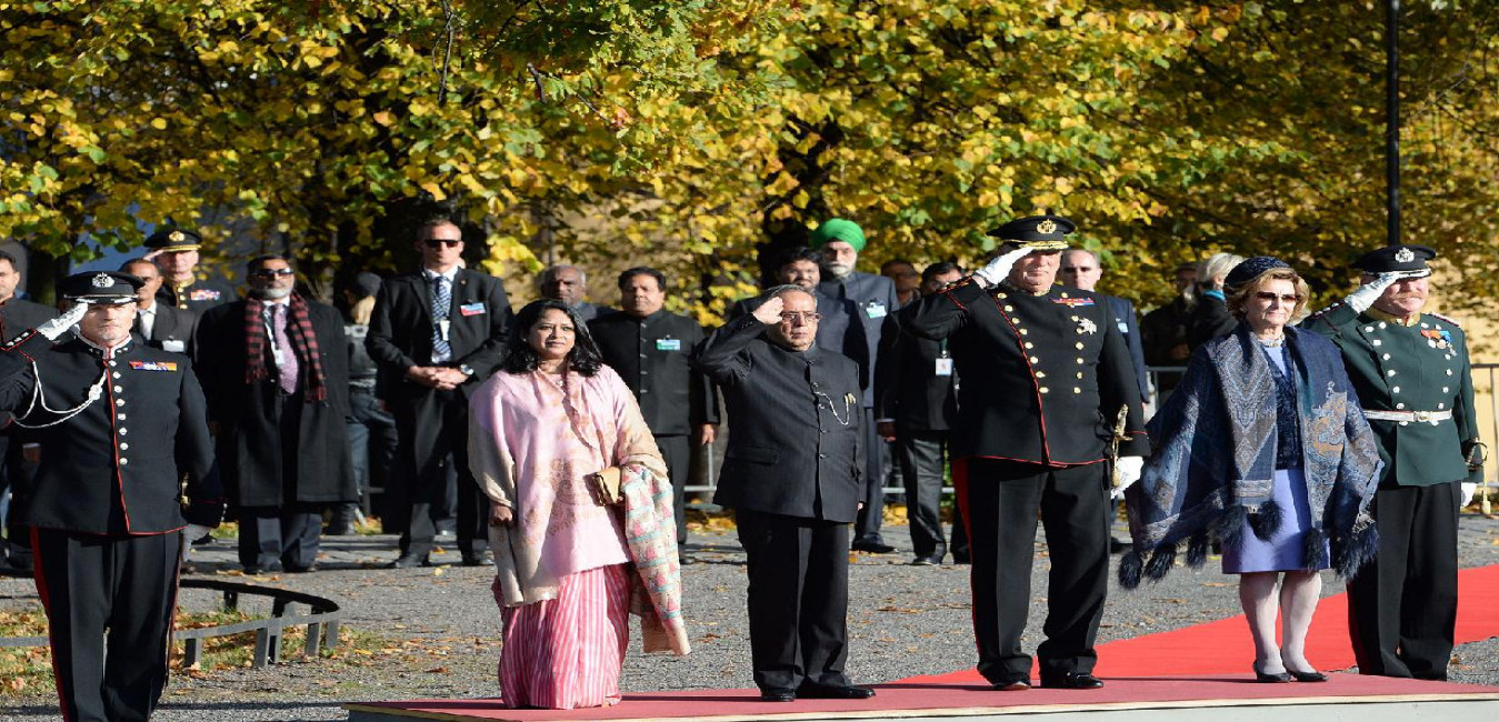 The President of India, Shri Pranab Mukherjee being Accompanied by HM the King and inspecting the Guard of Honour, laying of wreath by Soldiers at National Monument Akershus at Oslo in Norway on Oct 13, 2014