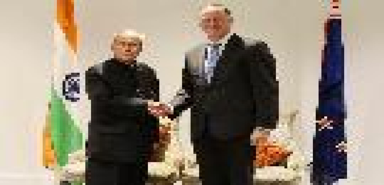 The President of India, Shri Pranab Mukherjee and the Prime Minister of New Zealand, Mr. John Key witnessing the Signing of agreement between India and New Zealand on direct flight service between India and New Zealand, at Auckland in New Zealand on May 01, 2016.