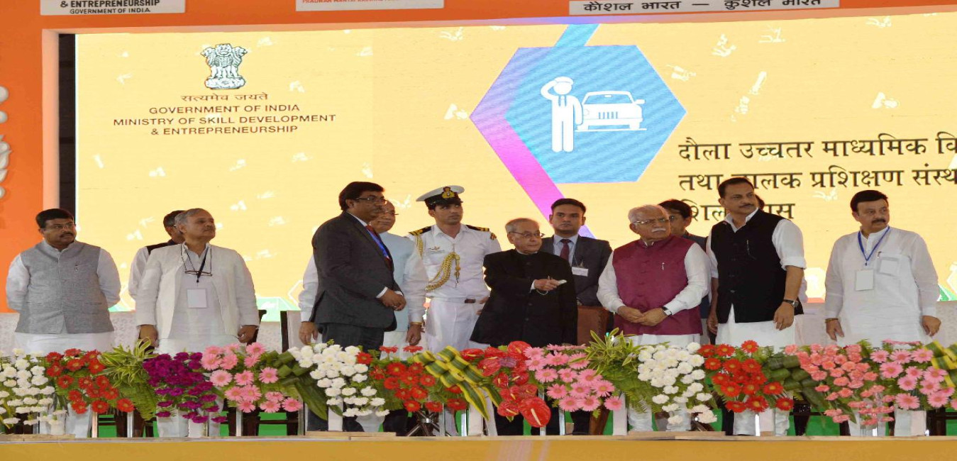 The President of India, Shri Pranab Mukherjee witnessing the exchange of MoUs and distributing the certificates to students/trainees under various initiatives, at the Foundation Stone laying of The Driver's Training Institute & Secondary School under the Smart Gram Initiative, at village Dhaula, Gurugram, in Haryana on June 02, 2017.