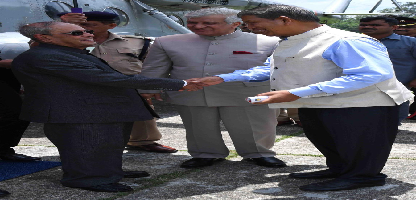 The President of India, Shri Pranab Mukherjee being received by the Governor of Uttarakhand, Dr. Krishan Kant Paul and the Chief Minister of Uttarakhand, Shri Harish Rawat on his arrival, at GTC Helipad, in Dehradun on June 22, 2016.
