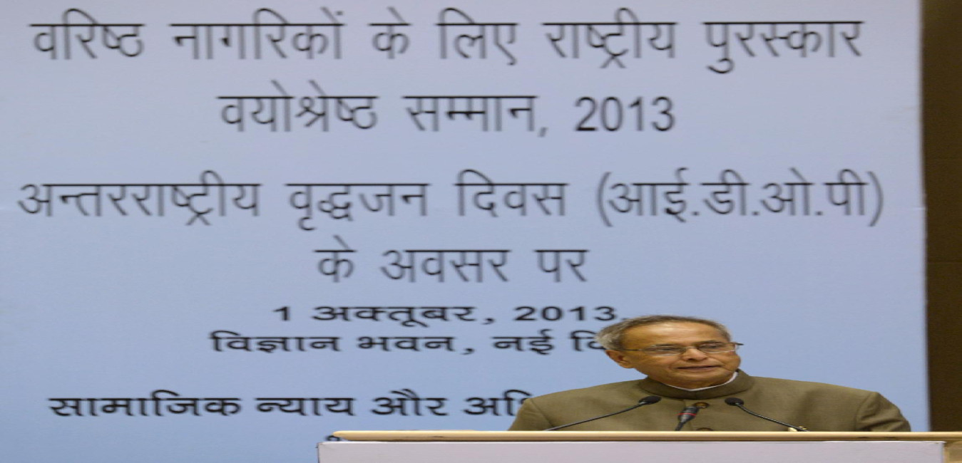 The President of India, Shri Pranab Mukherjee presenting the National Awards for Senior Citizens - Vayoshreshtha Samman on the occasion of International Day Older Persons at Vigyan Bhavan in New Delhi on Oct 01, 2013