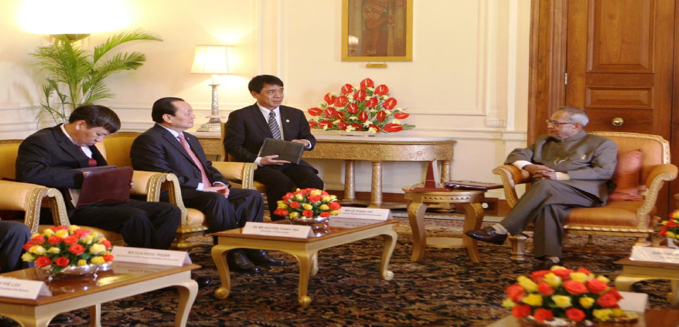 The Politburo Member of Vietnam Communist Party and Secretary of Ho Chi Min City Party Committee, HE Mr Le Thanh Hai calling on the President of India, Shri Pranab Mukherjee at Rashtrapati Bhavan in New Delhi on March 14, 2013