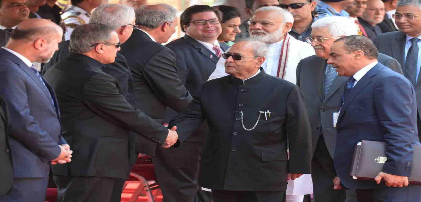 The President of India, Shri Pranab Mukherjee receiving HE Mr. Mahmoud Abbas, President of the State of Palestine, during his Ceremonial Reception, at Forecourt of Rashtrapati Bhavan on May 16, 2017.