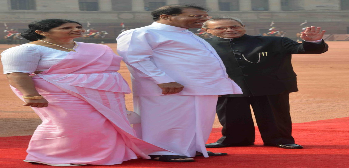 The President of India, Shri Pranab Mukherjee, receiving the President of the Democratic Socialist Republic of Sri Lanka, HE Mr Maithripala Sirisena, during his Ceremonial Reception, at Rashtrapati Bhavan, in New Delhi on Feb 16, 2015. Mrs Jayanthi Sirisena is also seen.