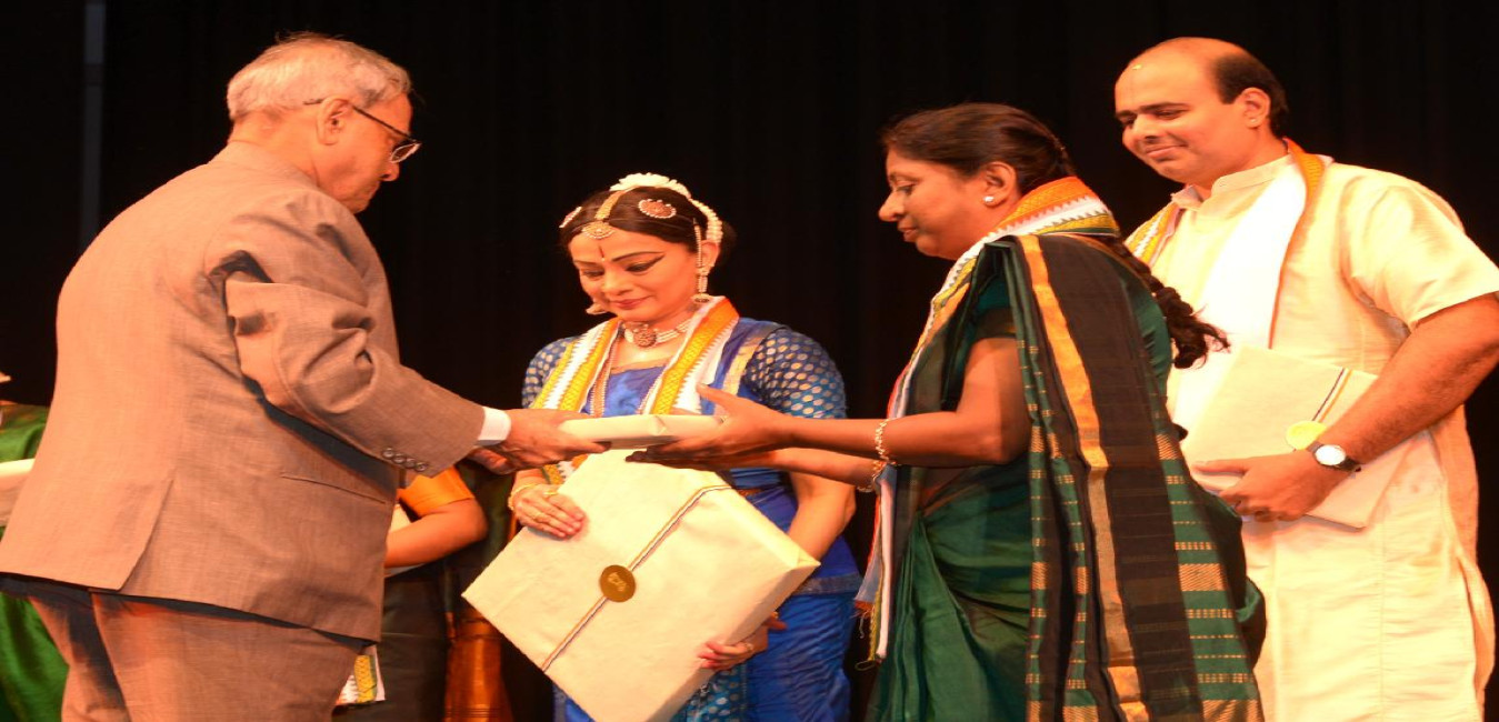 The President of India, Shri Pranab Mukherjee with the Artists after witnessing a Bharatanatyam Performance by Malavika Sarukkai and others at Rashtrapati Bhavan Auditorium in New Delhi on August 16, 2014